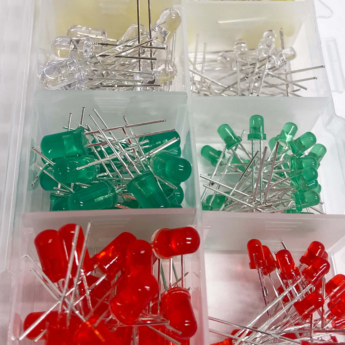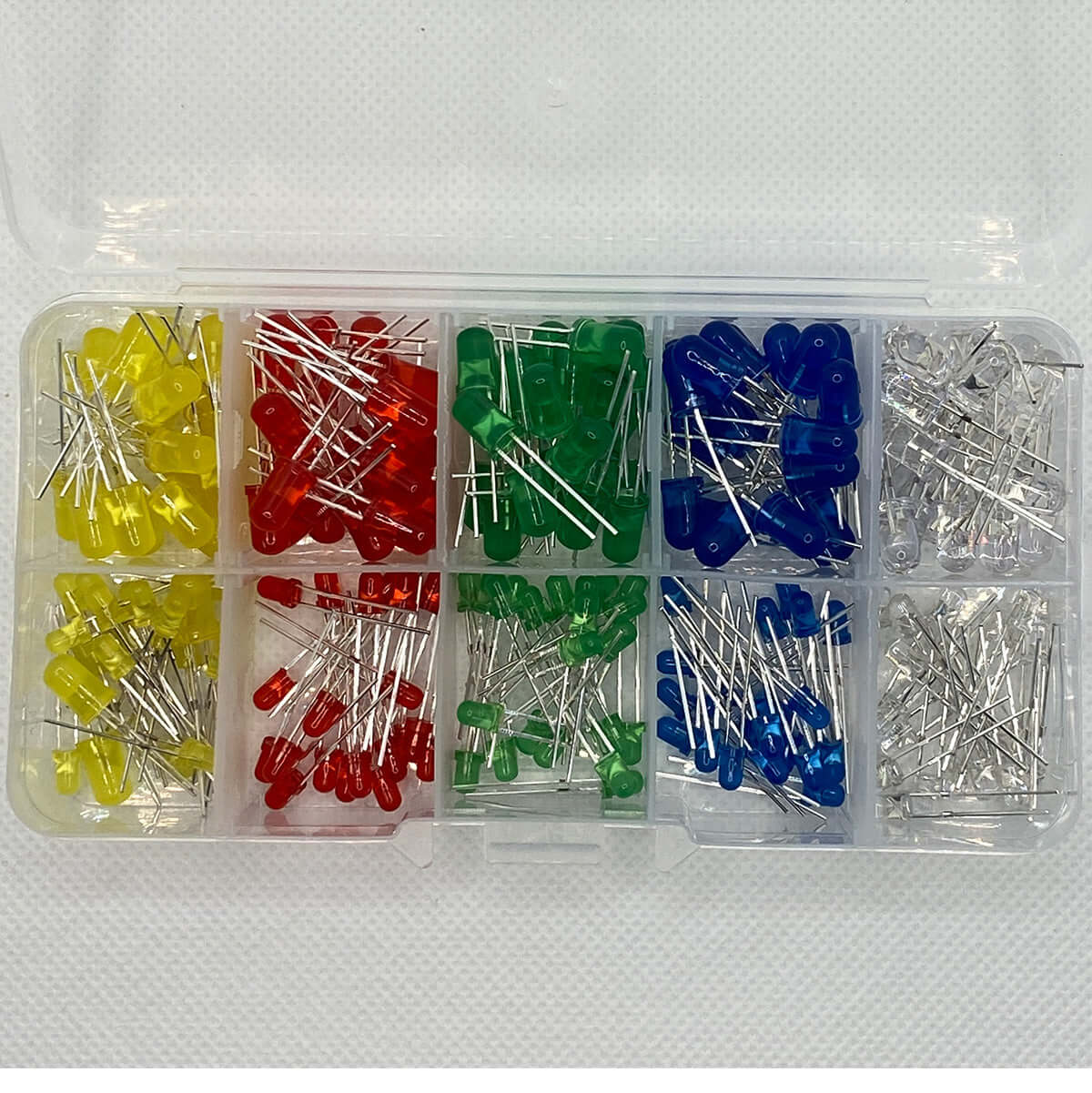 This super pack contains 100pcs of 3mm and 100pcs of 5mm LEDs in these 5 colors: