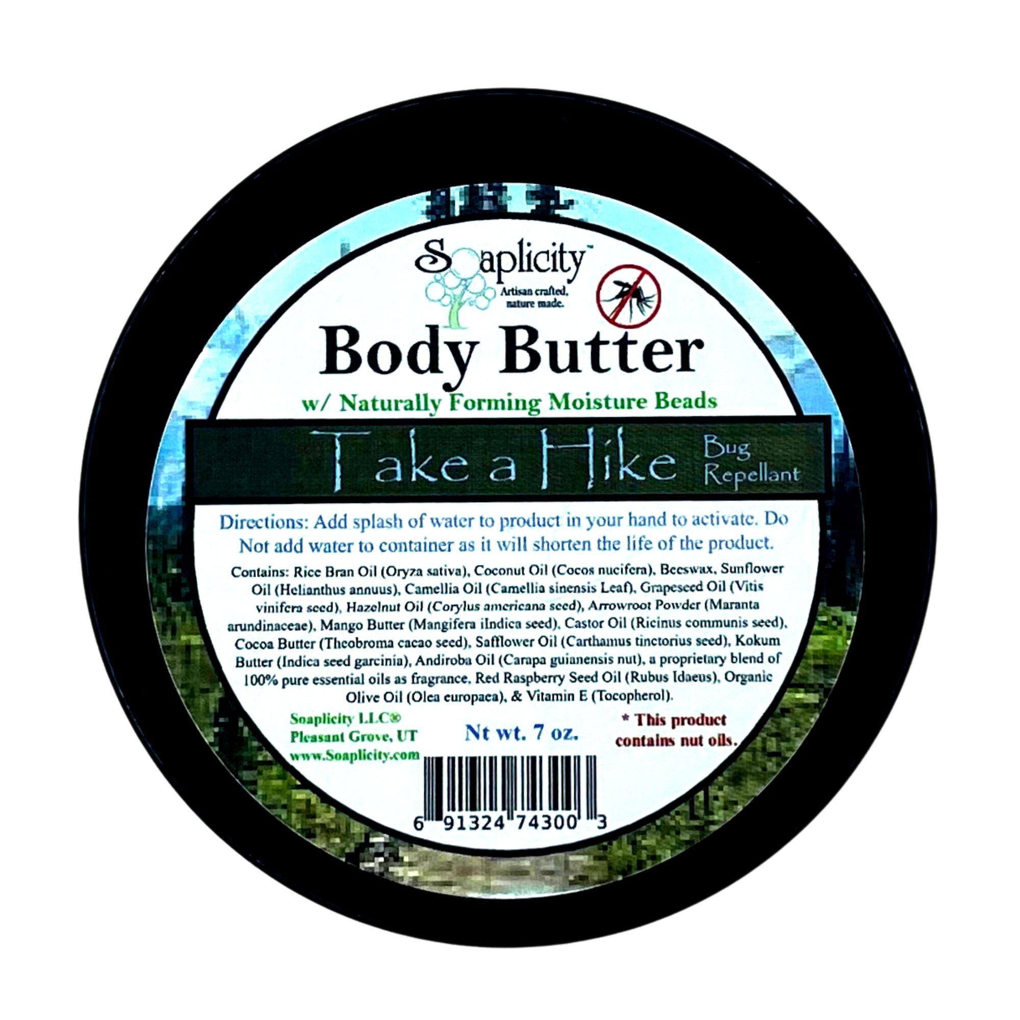 Tell bugs to take a hike this season! Our Take a Hike Body Butter was developed as the request of our customers who love our Take a Hike Bug Repellent Lotion Soap Bars and Lotion Bars, yet wanted extra coverage that included moisturization and easy application. Look no further!