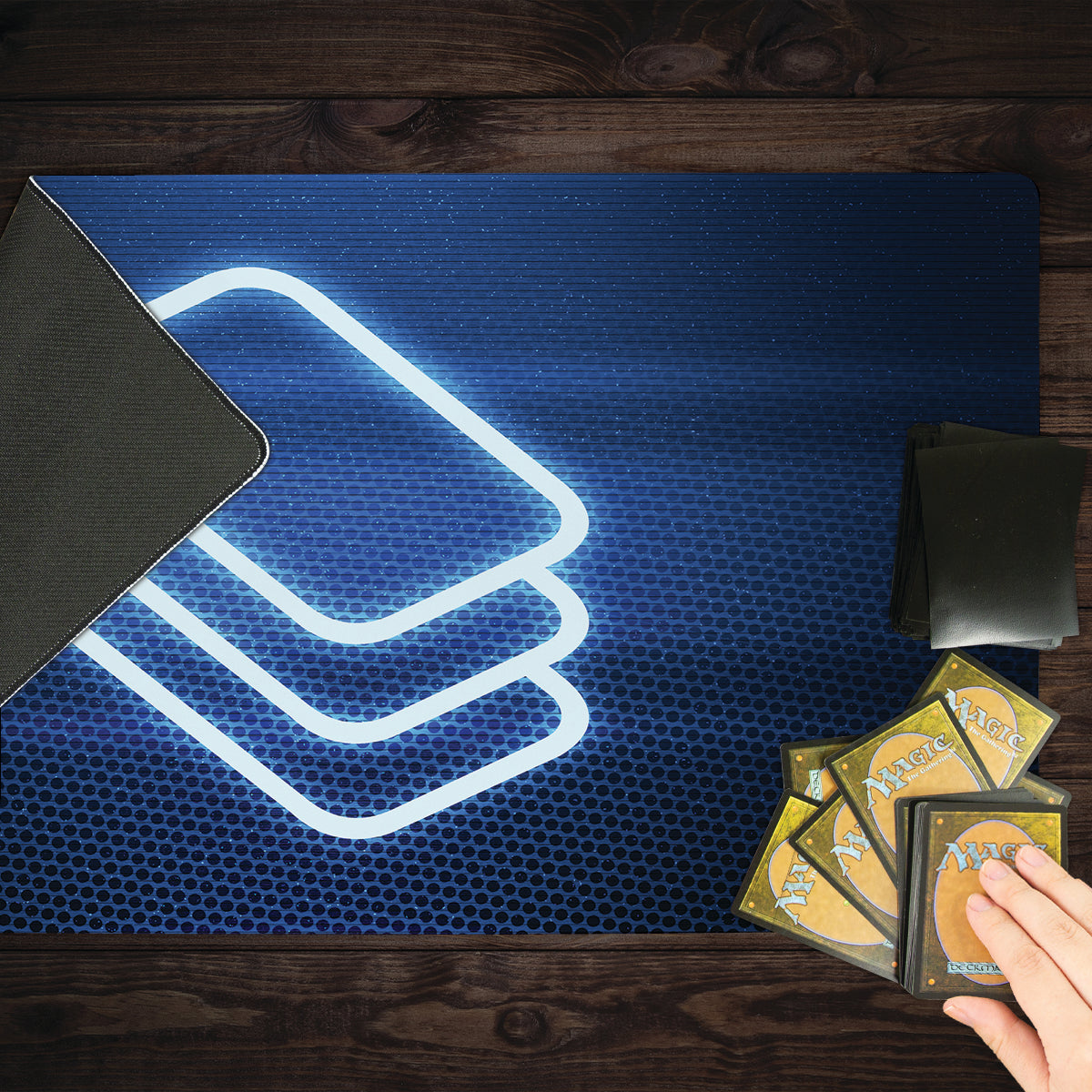 Standard Playmat measures at 24” x 14” inches and is 1/16 of an inch thick. It’s made with a smooth cloth top and strong rubber backing.