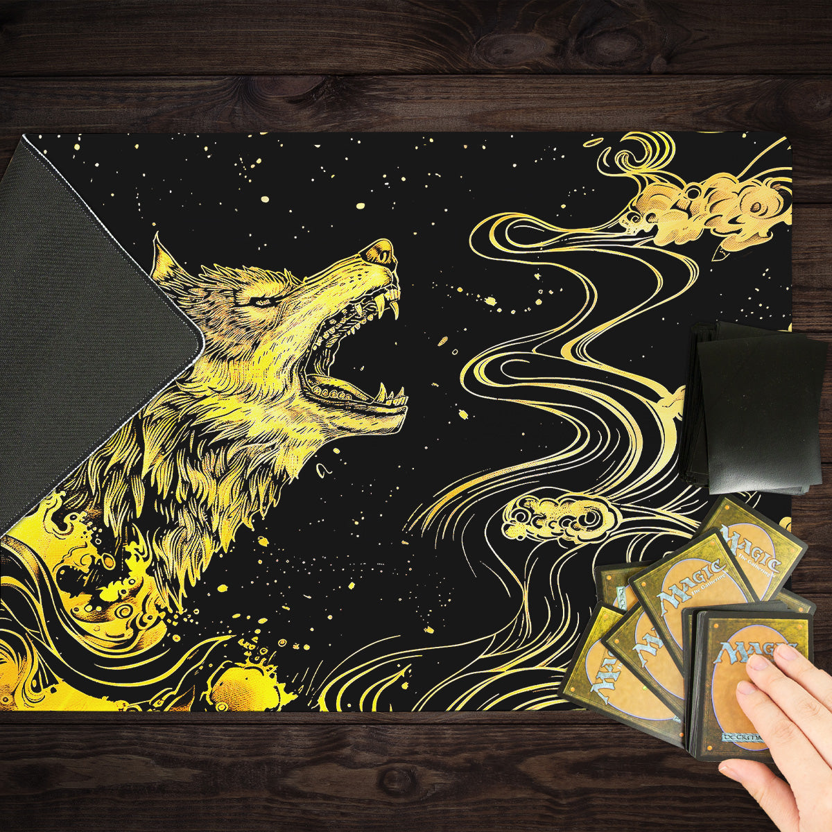 Standard Playmat measures at 24” x 14” inches and is 1/16 of an inch thick. It’s made with a smooth cloth top and strong rubber backing.