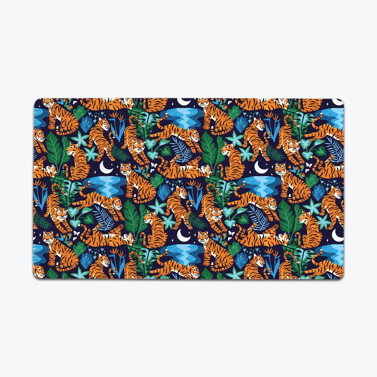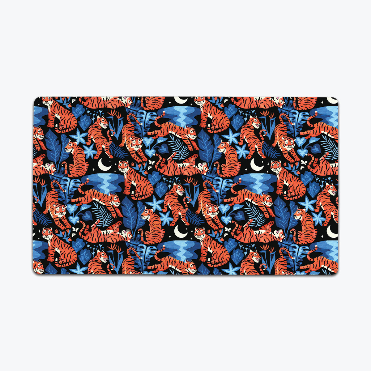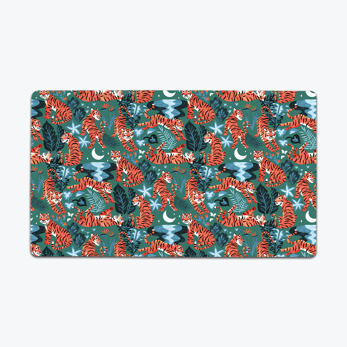 Oversized Playmat measures at 28” x 14” inches and is 1/16 of an inch thick. It’s made with a smooth cloth top and strong rubber backing.