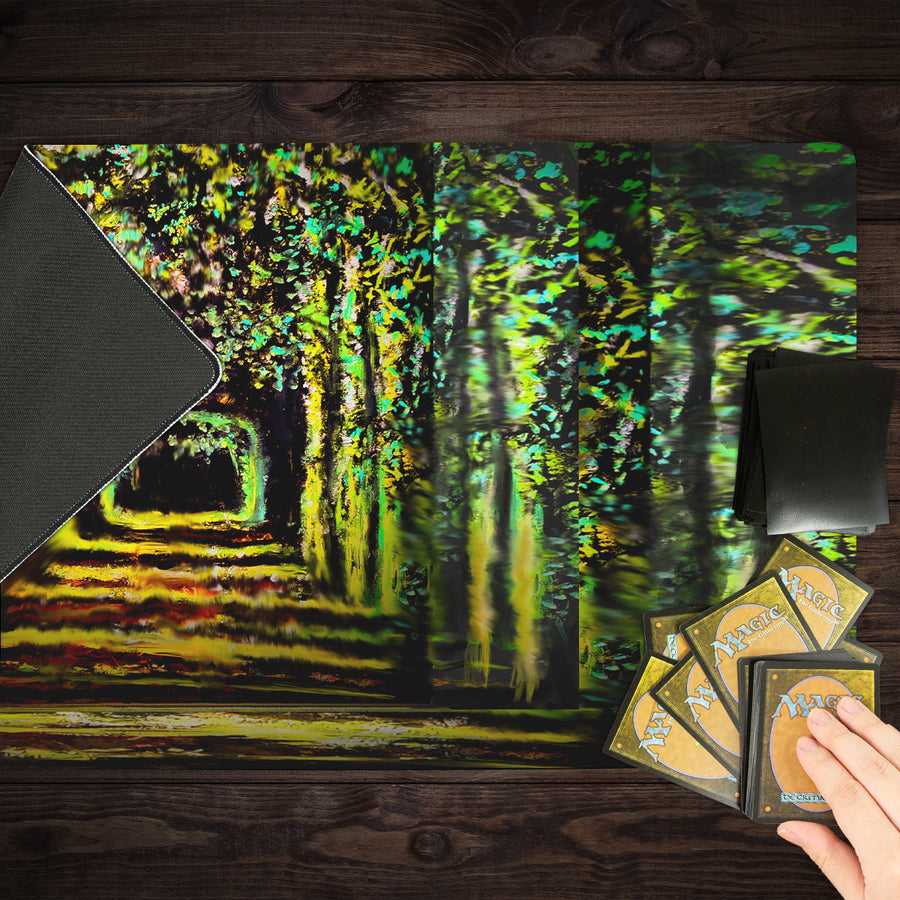 Oversized Playmat measures at 28” x 14” inches and is 1/16 of an inch thick. It’s made with a smooth cloth top and strong rubber backing.