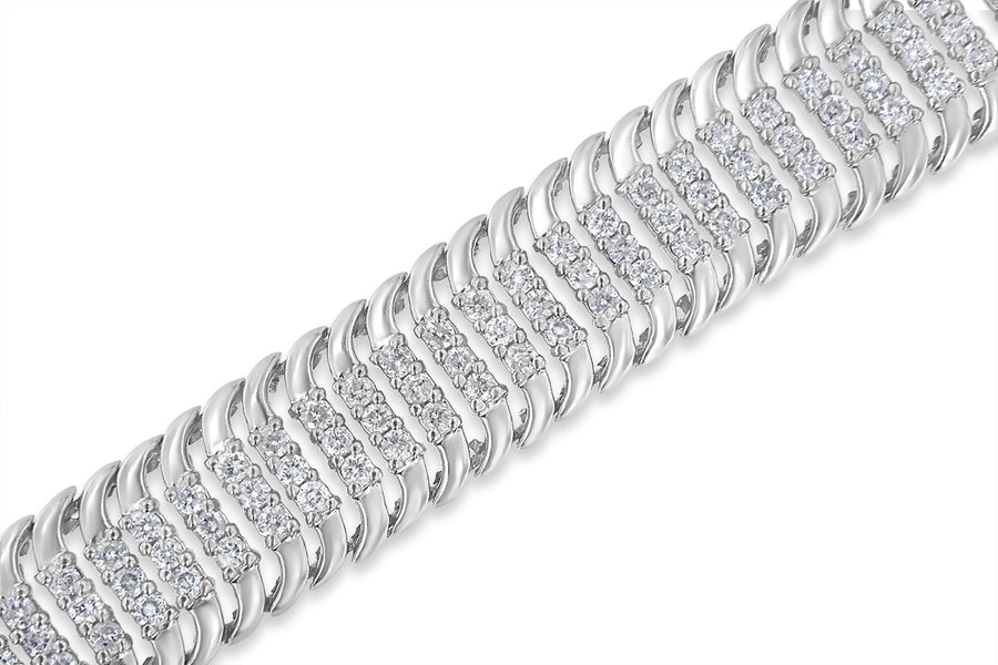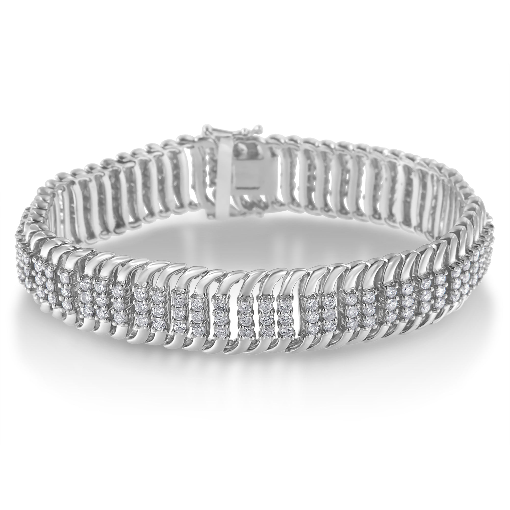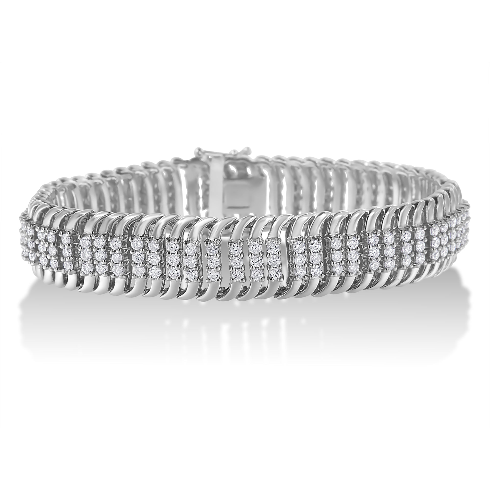 A must have for any serious jewelry collection, this stunning 14K white gold tennis bracelet boasts an impressive 5.0 carat total weight of diamonds with a whopping 192 individual stones. The bracelet features S-shaped links with three prong set, round, brilliant cut diamonds flanked by waves of white gold. Each diamond studded link is connected by hinges. Elegant and timeless, this gorgeous 7†tennis bracelet fastens securely with a box with tongue and safety clasp. This classic, elegant bracelet makes a great gift for any special occasion! Whether worn for daytime glamour or evening sparkle, this bracelet is gorgeously versatile. Give her a gift that will perfectly complement her favorite ensemble.