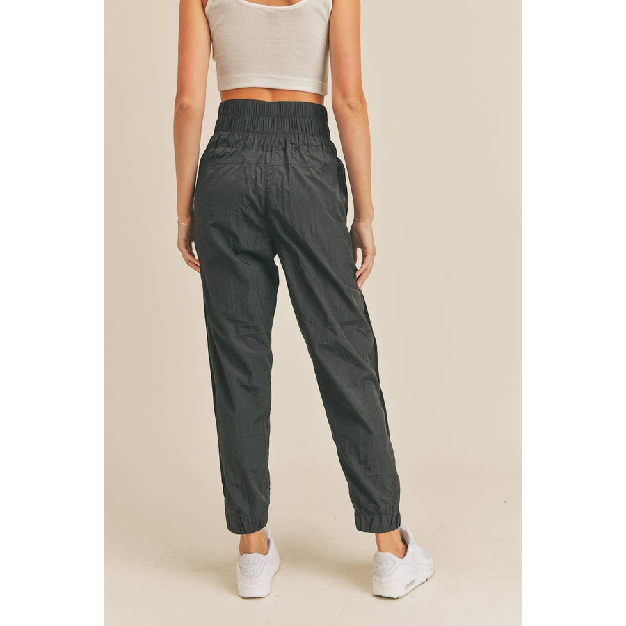 Crafted from 100% lightweight nylon, they deliver an airy feel with a modern edge—perfect for on-the-go days or laid-back lounging. The high-rise waistband flatters while providing a secure, stay-put fit.