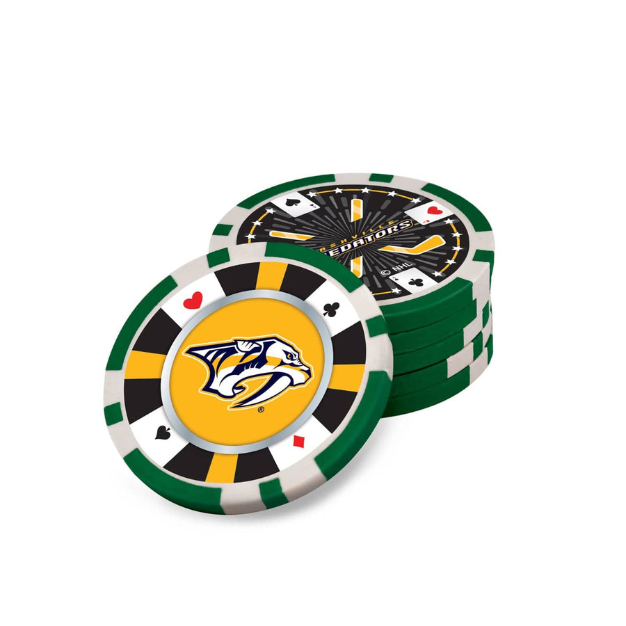 Looking for a great way to support your favorite team on poker night? Well, ante up with MasterPieces officially licensed NHL Nashville Predators 300 Piece Casino Style Poker Chips! These heavy 11.5-gram chips are perfect for Texas Hold'EM, Blackjack, card games, and much more. The poker set includes 300 high-quality standard-colored poker chips (11.5g) featuring two unique team designs. 60 White Chips, 60 Red Chips, 60 Blue Chips, 60 Green Chips, and 60 Black Chips. 6 standard-size (16mm) dice featuring your team's logo and colors on each die, 2 decks of playing cards with card-back designs featuring your favorite team's logo. All face cards and jokers have detailed custom team designs. 1 dealer button. Plus, an easy-to-carry sturdy aluminum case has a black velour interior to protect and organize poker chips, playing cards, and dice.