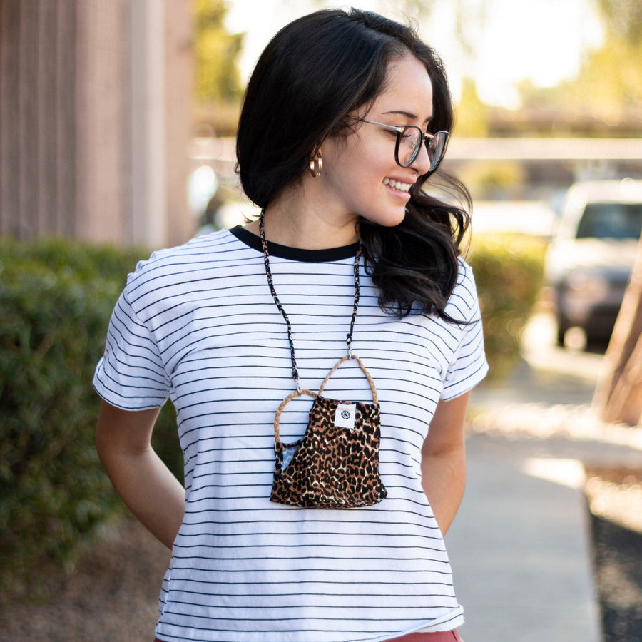 Elevate your face mask game with the Black Leopard Face Mask Holder by Pomchies. This lightweight and secure lanyard strap is made from soft braided nylon, perfect for keeping your mask clean and out of the way. Whether worn in your hair or on your wrists, this Oeko Tex approved accessory is a practical and stylish solution for everyday mask-wearing. Looking for a unique and useful gift? Consider the Pomchies Black Leopard Face Mask Holder. Made from swimwear-like fabric, this 26" long lanyard strap with clips is easy to wear and versatile in its uses. From keeping your mask handy to using as napkin rings, this accessory is a thoughtful and practical gift idea for anyone on your list.