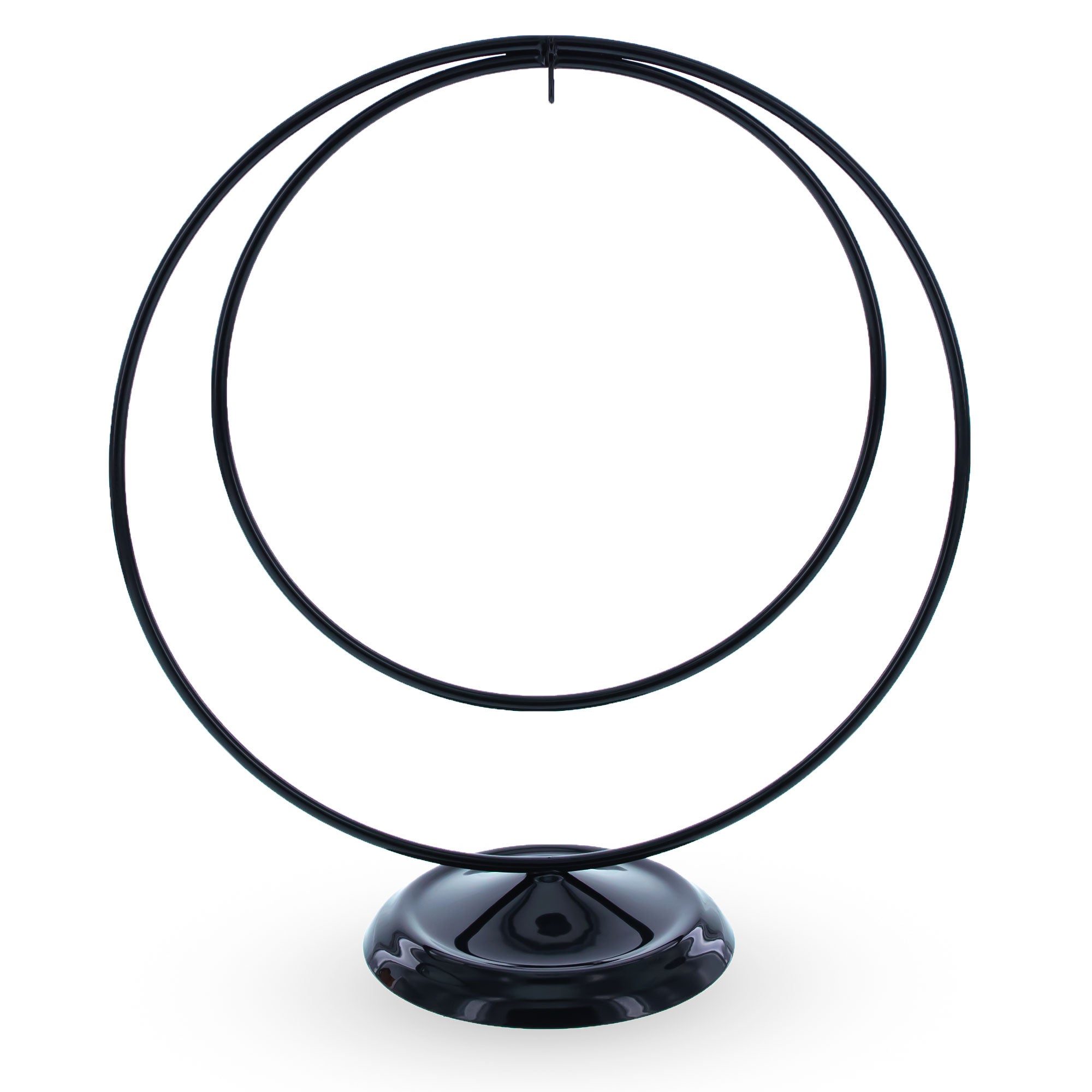 Showcase your favorite ornaments in modern elegance with this 8.2-inch double circle display stand. Crafted from smooth black painted metal, its minimalist design features two concentric hoops that create a striking geometric silhouette. The balanced frame holds your ornament securely at center stage, making it perfect for highlighting delicate baubles, crystals, or keepsakes. A wide, rounded base ensures stability on shelves, mantels, or countertops. Ideal for holiday décor, special gifts, or year-round displays, this stand blends contemporary style with timeless simplicity.