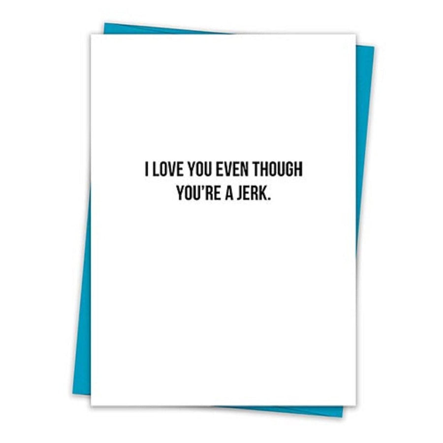 Let someone you love know you're thinking about them by sending this greeting card that reads "I LOVE YOU EVEN THOUGH YOU'RE A JERK."