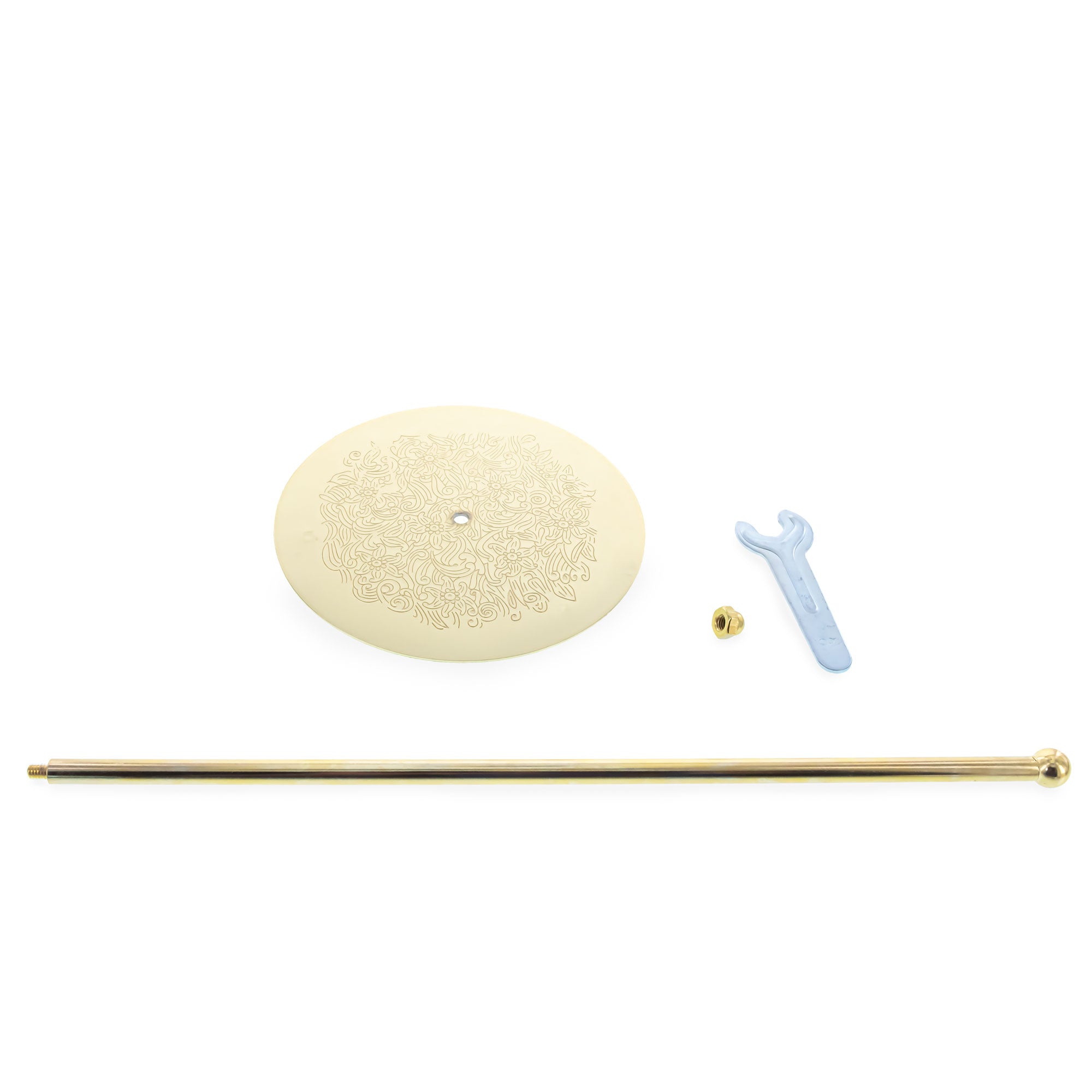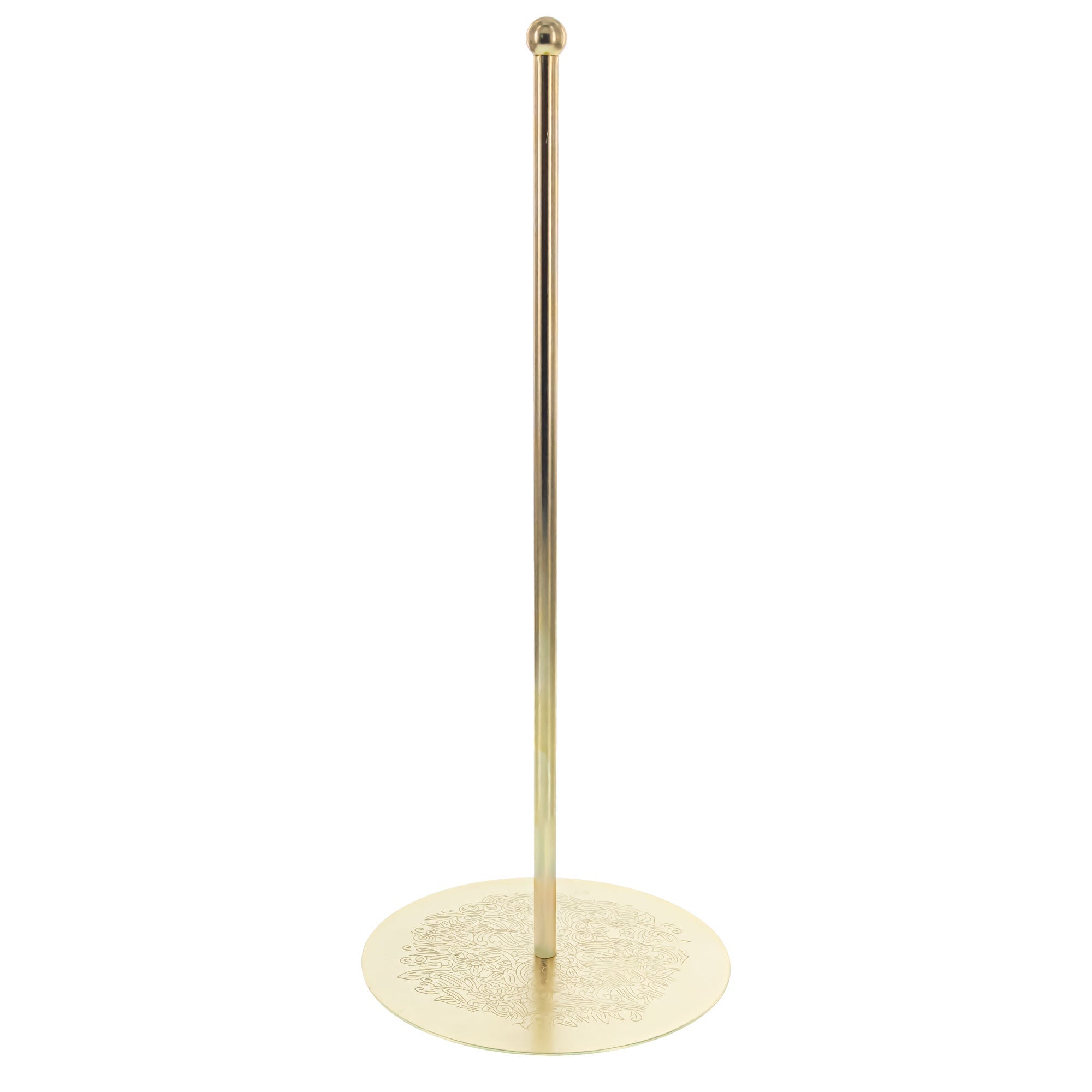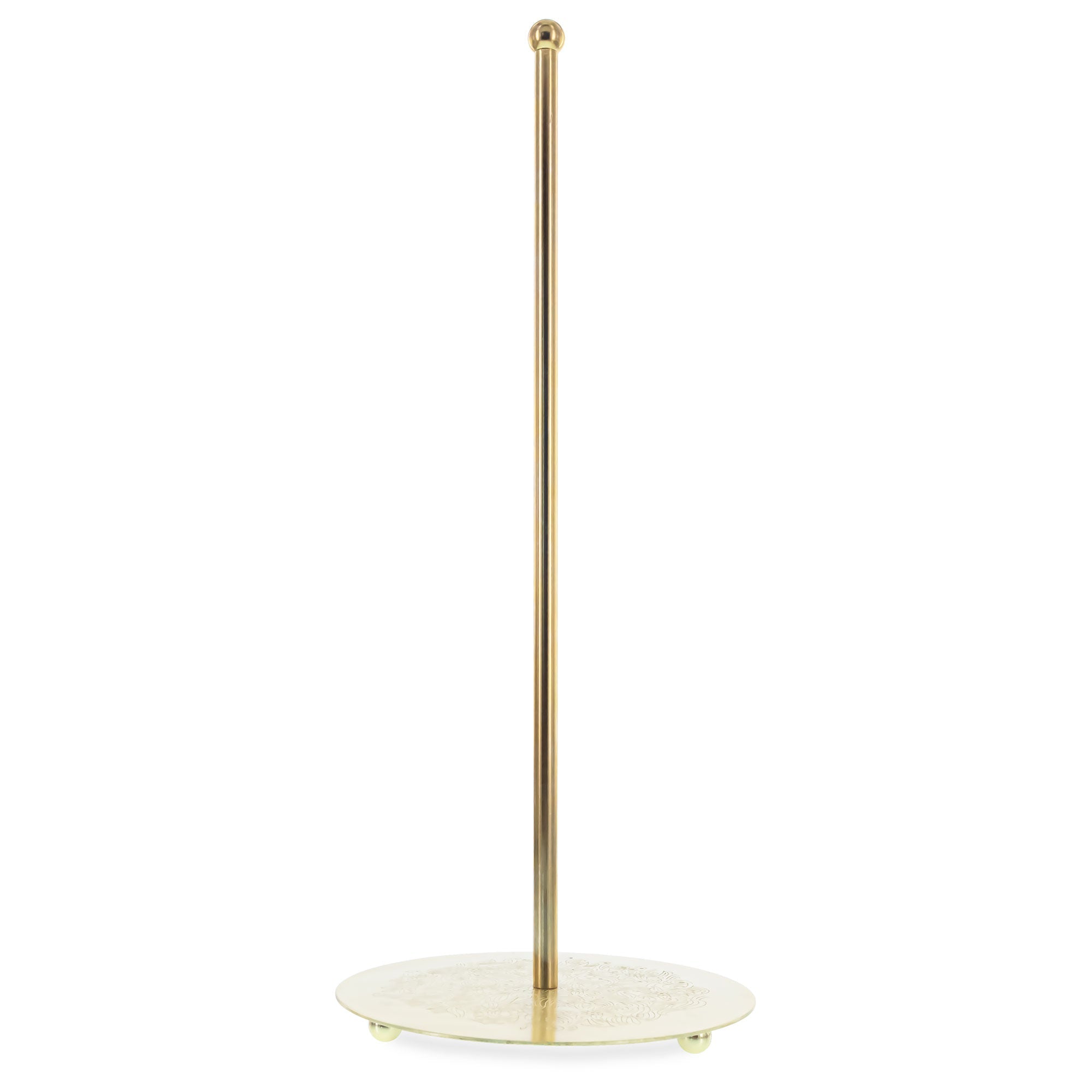 Display your treasured tree topper with timeless elegance using this Ornate Rod Stand. Featuring a tall, vertical rod and a solid round base, this display stand seamlessly blends aesthetic appeal with reliable functionality. The radiant gold finish and subtly embossed base lend a vintage charm that enhances seasonal décor, wedding themes, or everyday displays.