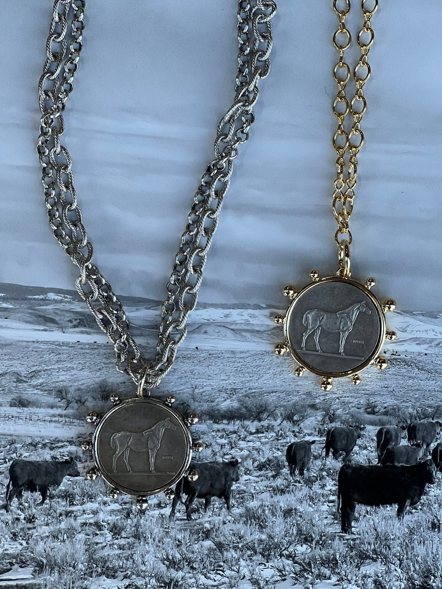 Wrap your neck in history and swagger with this Silver Horse Coin Double Chain Necklace — two sleek silver chains layered just right, holding a vintage-style coin pendant that tells a story of wild roads and dusty trails. It's your conversation starter, your good-luck charm, your everyday front-row badge on the range.