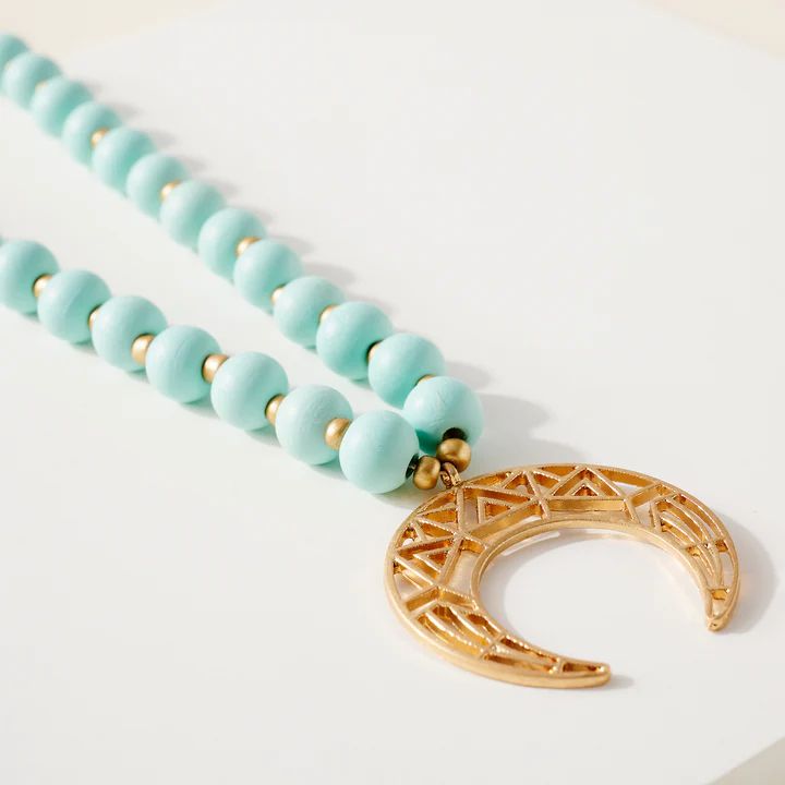 Elevate your outfit with the Wood Bead Crescent Pendant Necklace in ivory or mint, featuring a delicate gold-plated pendant for a touch of sophistication. This 31" necklace by Avenue Zoe is a stylish addition to any wardrobe, perfect for casual or dressy occasions. Looking for a unique gift for a fashion-forward friend? Consider gifting them this chic Wood Bead Crescent Pendant Necklace, available in ivory or mint. With its elegant design and high-quality materials, it's sure to be a thoughtful and stylish present.