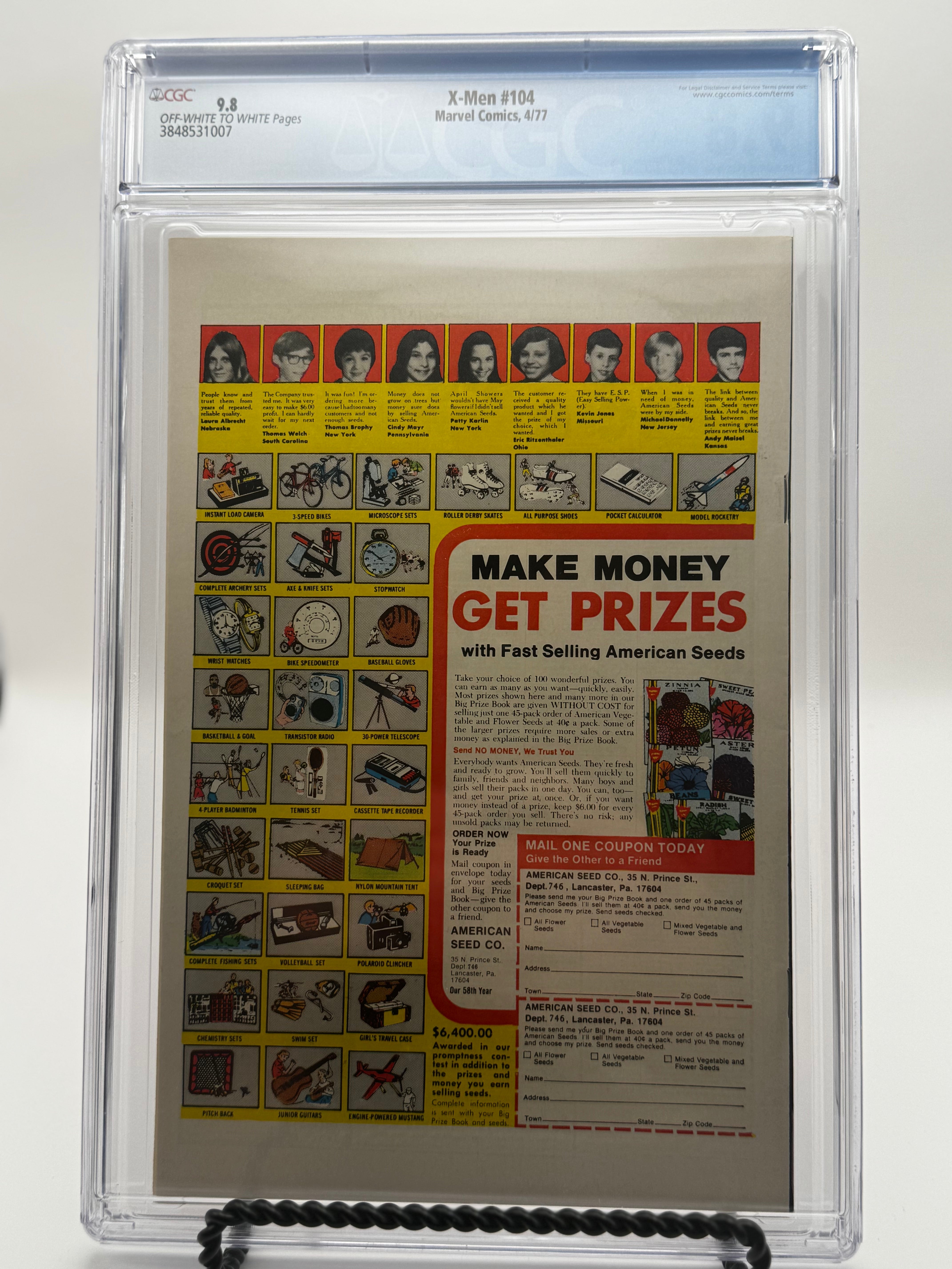 Own a piece of X-Men history with X-Men #104, graded a pristine CGC 9.8 and encapsulated in a blue label! This 1977 issue, written by Chris Claremont with art by Dave Cockrum and Sam Grainger, features the first cameo appearance of the Starjammers, a team of space pirates who will become key players in the X-Men universe. Plus, the cover by Dave Cockrum pays homage to the classic X-Men #1, making this a must-have for any X-Men fan or collector.