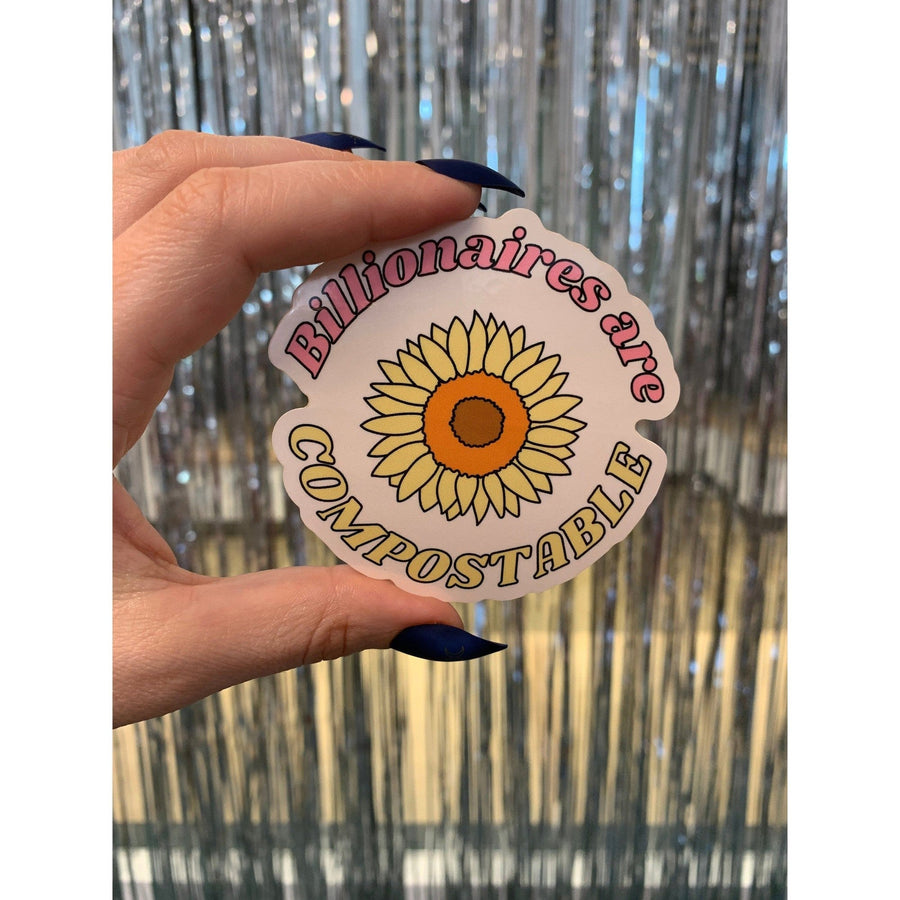 Glossy die cut sticker reads BILLIONAIRES ARE COMPOSTABLE with daisy flower at the center.