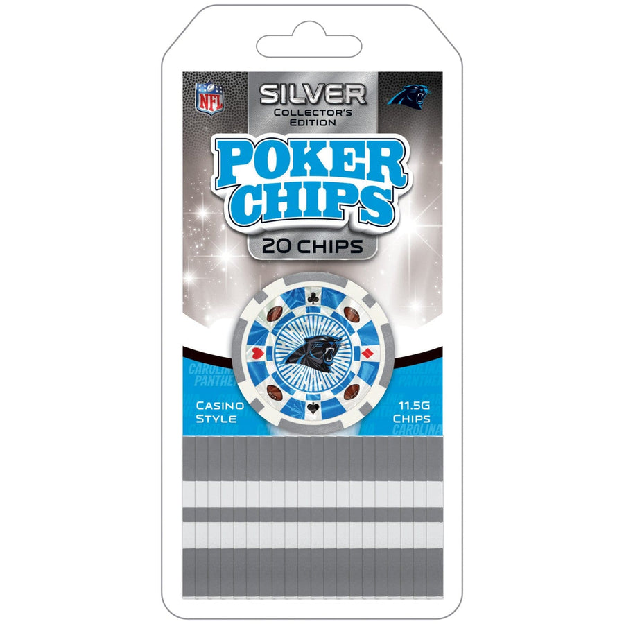 These Carolina Panthers poker chips are the perfect choice for all NFL Football fans! This Gold Collector's Edition set contains 20 casino-style chips. These poker chips are perfect for Texas Hold'em, Blackjack, tournaments, card clubs, and more! Each metallic colored poker chip has a Carolina Panthers design on both sides. Support your favorite NFL team with officially licensed and approved poker chips. Perfect for all fans!