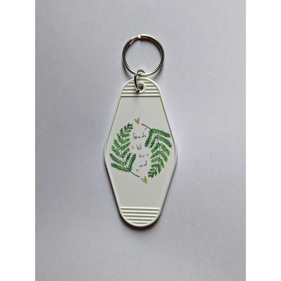 This Fronds Til The End Motel Style Keychain features custom artwork and the phrase "Fronds til the end" in black lettering. The keychain is designed to resemble classic hotel/motel key tags and measures approximately 3.75" x 1.75", made of plastic and metal with art by Kathryn Zeta Jaynes, available exclusively at Get Bullish.