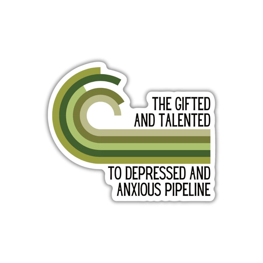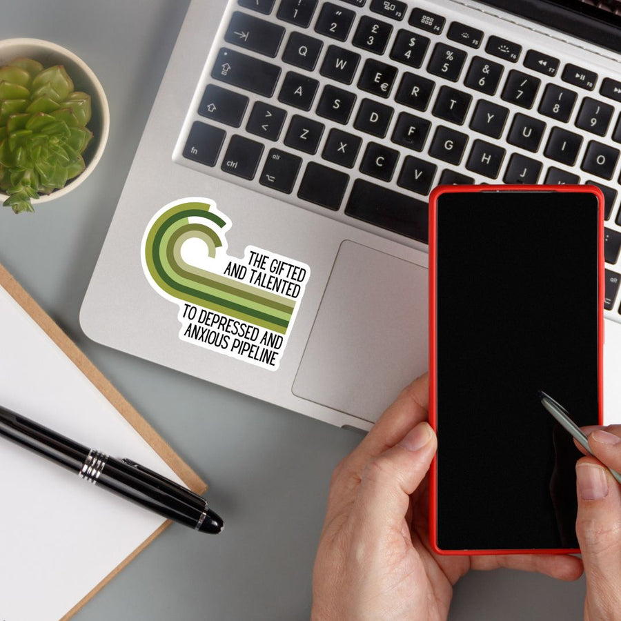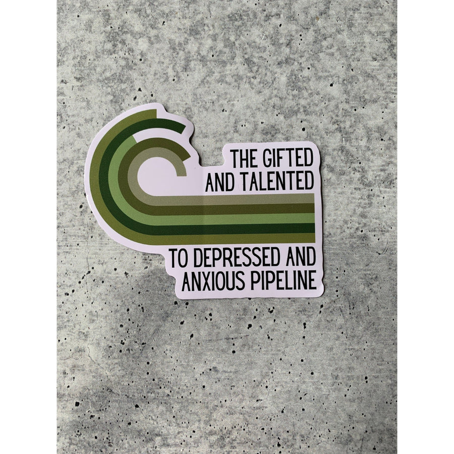 Add some flair to your laptop or water bottle with The Gifted And Talented To Depressed And Anxious Pipeline Die Cut Vinyl Sticker. This 3.54" x 2.95" sticker features a glossy finish to protect against UV rays and has a split back for easy application. Makes a unique and creative gift for the sticker enthusiast in your life.