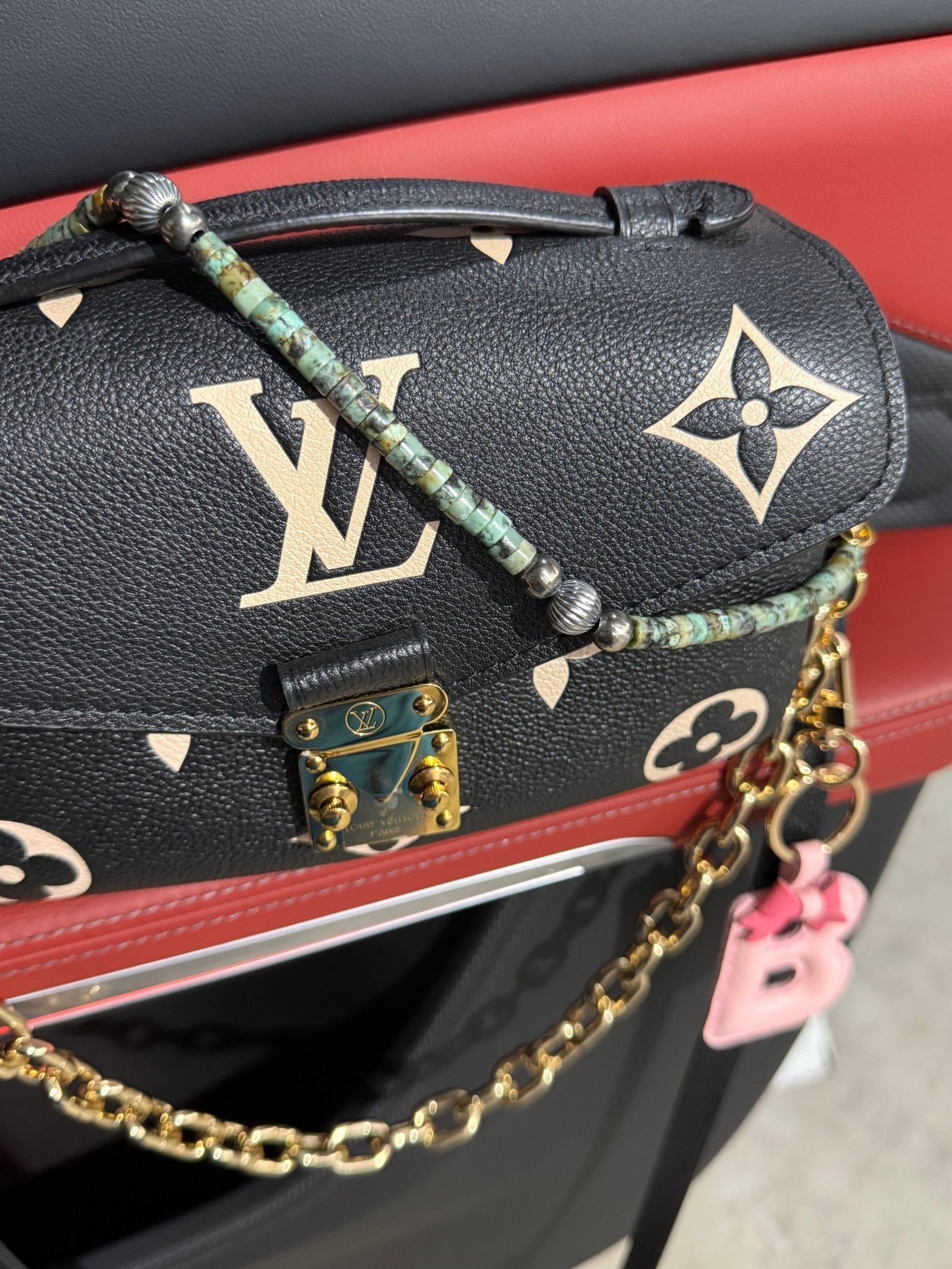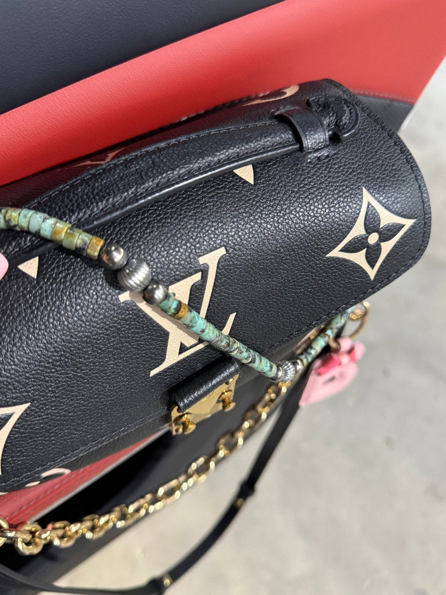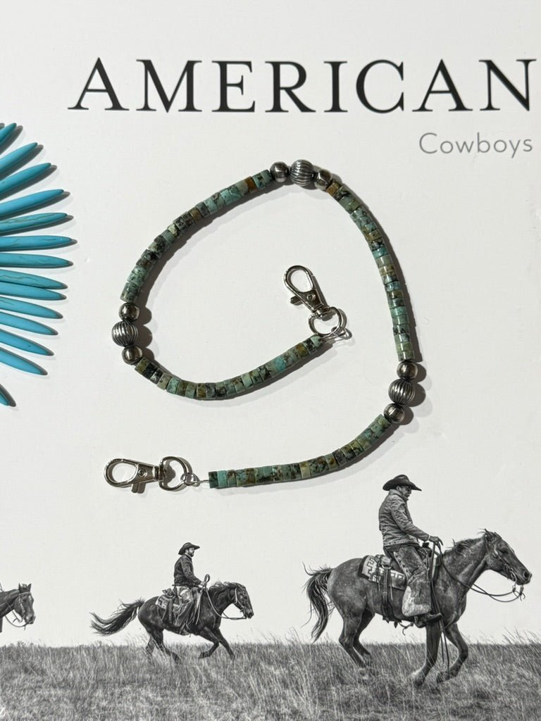 Add a touch of Western glam to your look with this Authentic Turquoise Heishi Purse Chain. Featuring vibrant turquoise stones accented with sterling silver pearls, this accessory blends rustic charm with modern elegance. Perfect for dressing up your favorite bag with a hint of Southwestern sophistication.