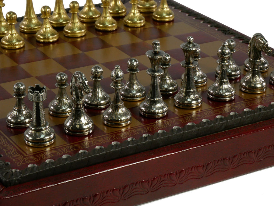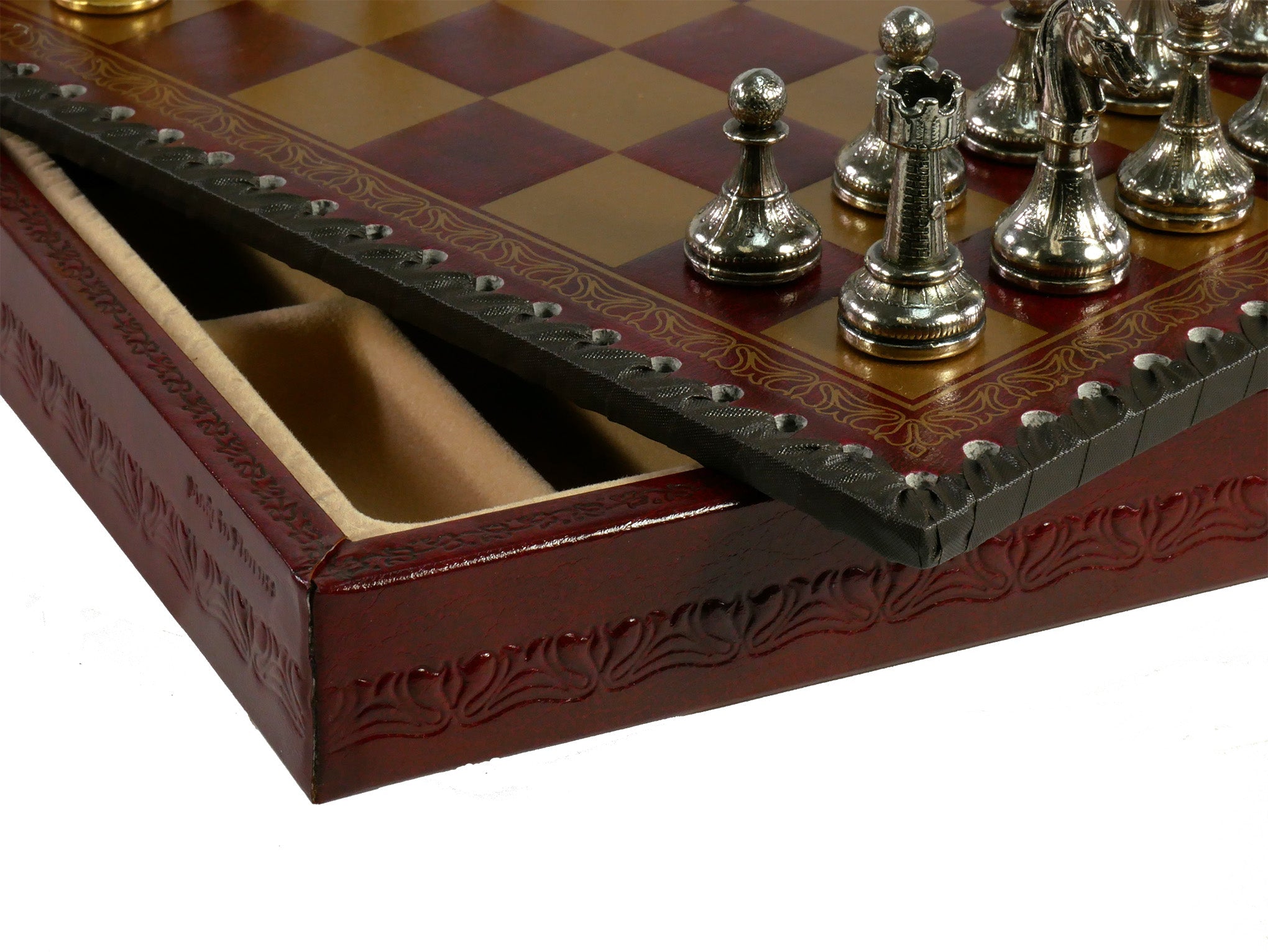 Staunton Metal Men 2" King on a Faux Leather Burgundy/Black Chest Dimensions 11"x11"x1.5" with 1" squares. Made in Italy