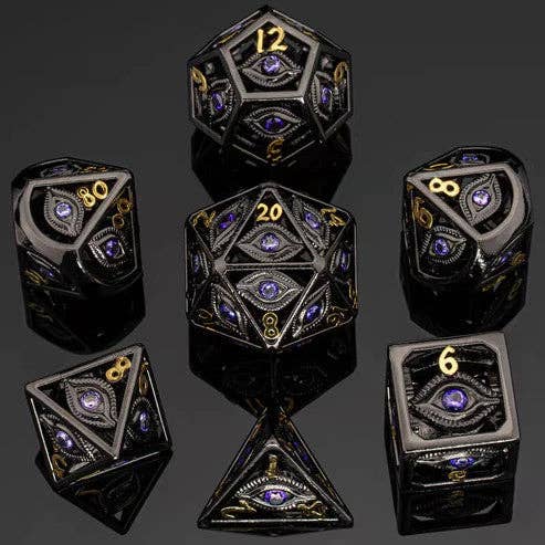 Eldritch Gaze: Our Dragon's Eye Hollow Metal dice set holds ancient power within its obsidian-black metal framework. Each of the seven polyhedral dice features meticulously crafted triangular windows that reveal mesmerizing purple gemstone "eyes" watching your every roll. Gold numbering contrasts perfectly against the dark metal, ensuring easy readability while adding a touch of forbidden luxury. The hollow design creates both visual intrigue and a satisfying weight balance that delivers consistent results across any gaming table. Perfect for warlocks bound to ancient patrons, followers of forgotten gods, or any player who appreciates that true power often comes with the weight of being watched by forces beyond mortal comprehension.