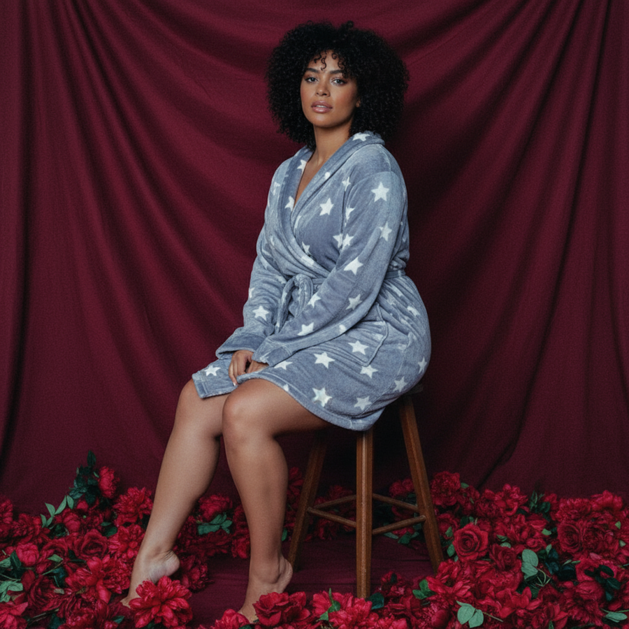 Mid-Length plush robe with star print design and self-tie waist closure.