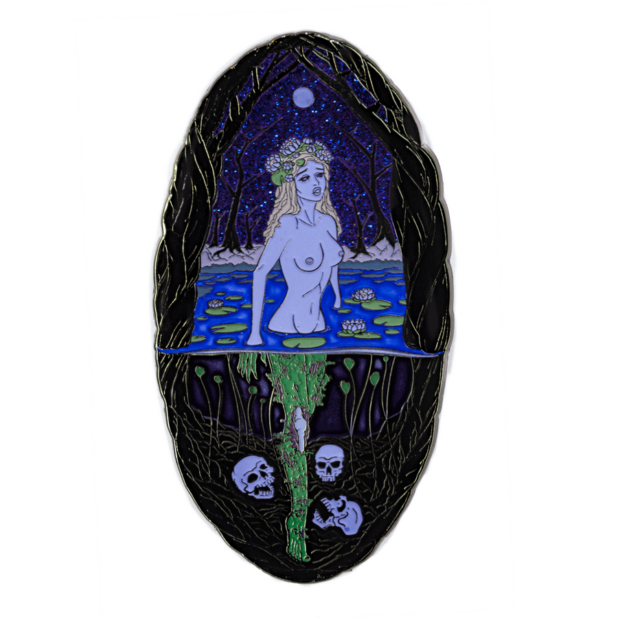 A monster of a pin at 5" tall, the Rusalka will command your attention and collection. The "Nocturne" edition features glitter, glow-in-the-dark, and pearlescent details to fascinate. Soft enamel + epoxy, limited edition of 99.