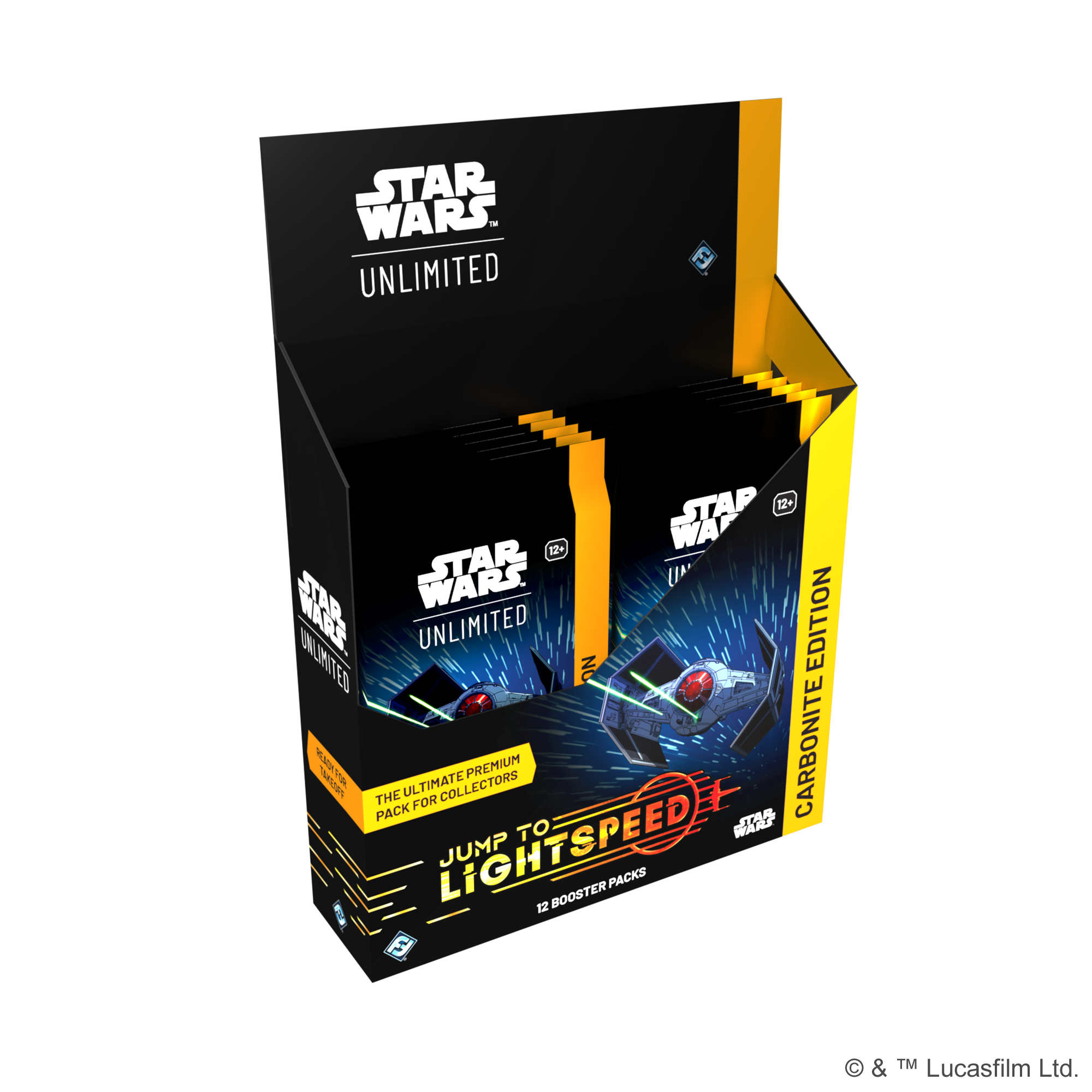 Take your Star Wars: Unlimited collection to the next level with this Carbonite booster display box containing 12 premium packs! Each luxury pack contains 16 cards including a Carbonite-exclusive Prestige card, Hyperspace variants, and premium foils. This limited-edition display focuses on epic space battles with special aesthetic treatments throughout. A must-have for serious collectors and players looking to add maximum style to their gameplay.