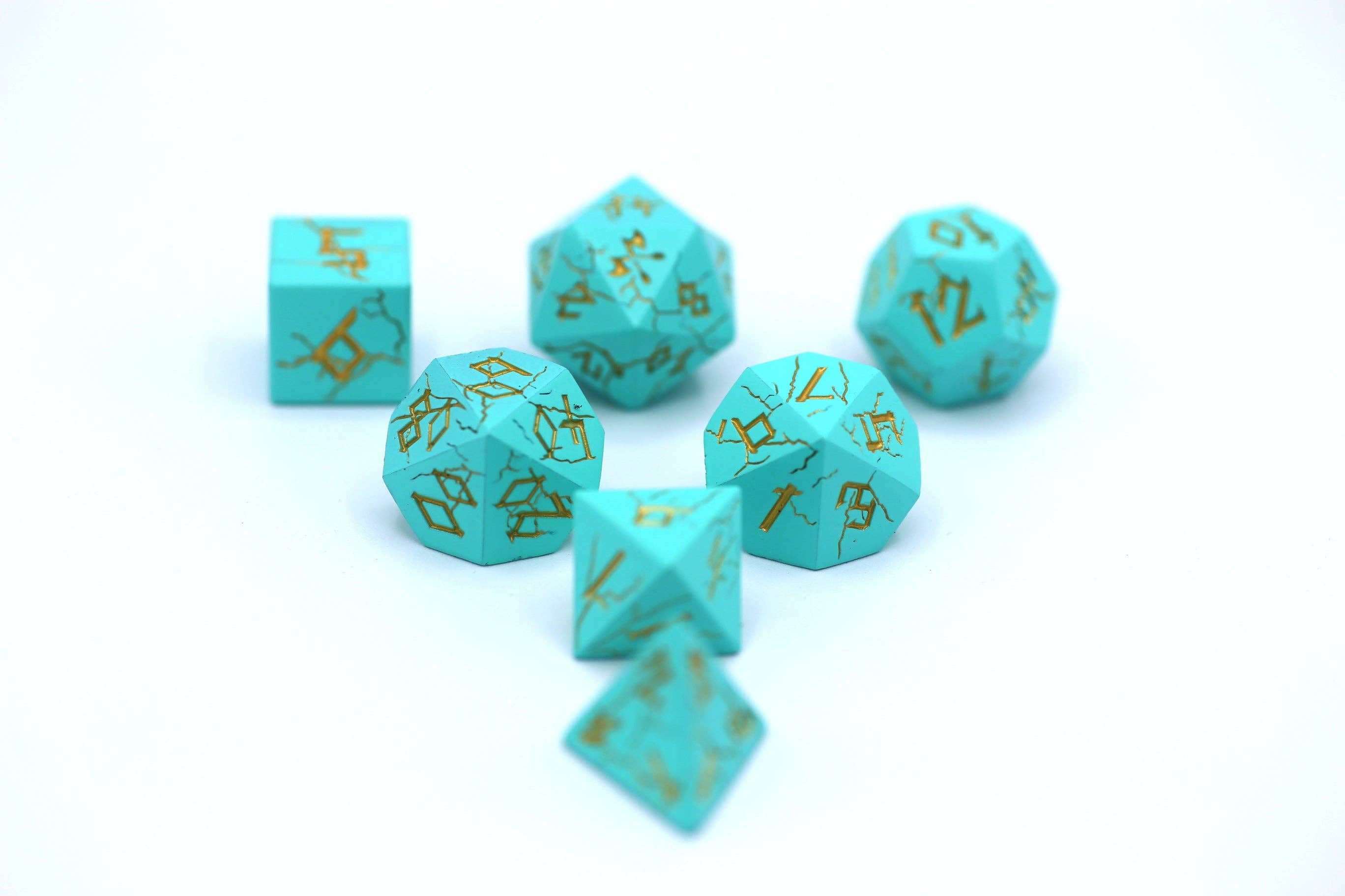 Crafted for both style and substance, these dice are ideal for Dungeons and Dragons, Pathfinder, Wargaming, and countless other tabletop adventures. The solid metal construction gives each roll a satisfying heft, while the vibrant turquoise color with silver accents ensures you'll stand out at any gaming table.