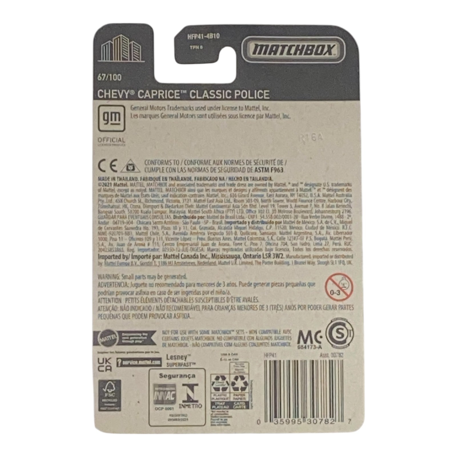 The Matchbox Chevy Caprice Classic Police is a fascinating piece for collectors and enthusiasts alike. This model is part of the Matchbox Series 67/100, showcasing excellent details and a classic design that resonates with the charm of the iconic Chevy Caprice. This model not only captures the essence of a police vehicle but also stands out in any collection. The realistic features and attention to detail make it an ideal item for display or play. Whether you’re a child or a collector, the Matchbox Chevy Caprice Classic Police is sure to impress.