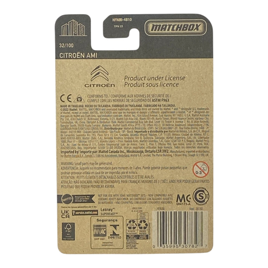 Introducing the Matchbox Citroen AMI, a stunning addition to the renowned Matchbox Series 32/100. This model captures the essence of the iconic Citroen AMI in a compact, collectible form. The Matchbox Citroen AMI is not just a toy; it is a piece of automotive history, showcasing the design and charm of one of the most beloved vehicles on the road. With exquisite details and finish, this model is perfect for collectors and automotive enthusiasts alike.