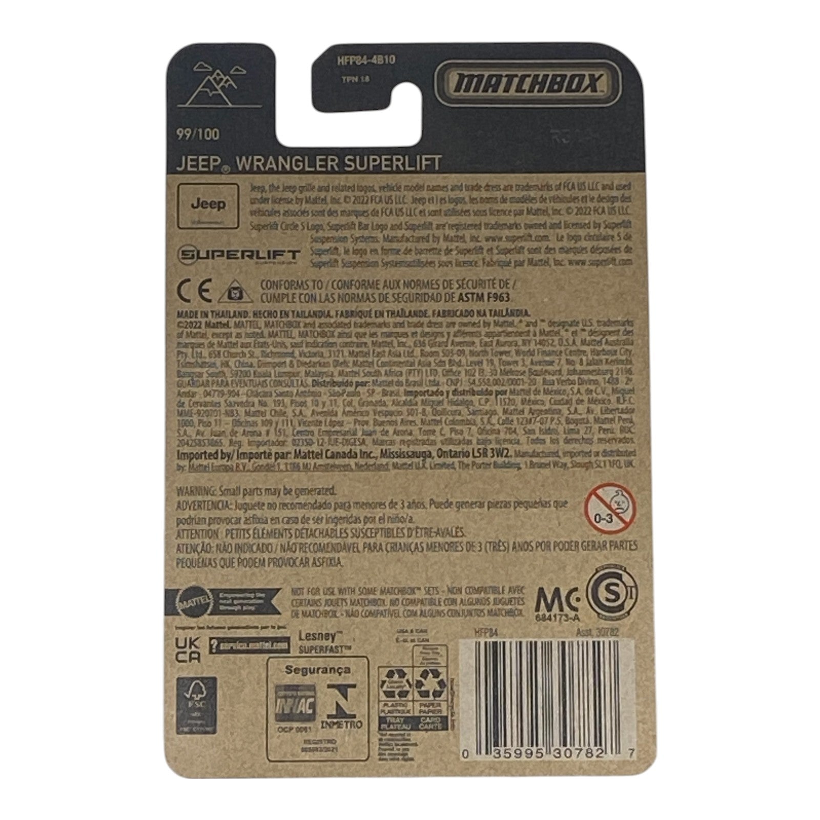 Welcome to the world of adventure with the Matchbox Jeep Wrangler Superlift, a captivating model from the renowned Matchbox Series 99/100. This exquisite die-cast replica not only captures the essence of the robust Jeep Wrangler but also amplifies its off-road prowess with the iconic Superlift suspension. Whether you're a collector or a child dreaming of epic road trips, this model is bound to excite and inspire.
