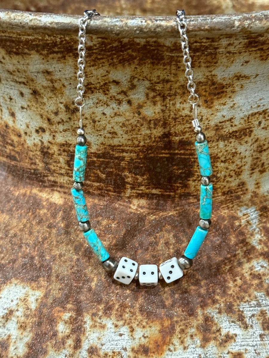 Turn heads with this Turquoise and Dice Slot Necklace, where playful symbolism meets rugged, southwestern style. This bold piece features genuine turquoise paired with a dice-slot motif charm — a nod to luck and chance — suspended from a durable sterling silver chain. This necklace brings character, color, and a little bit of good fortune to every outfit.