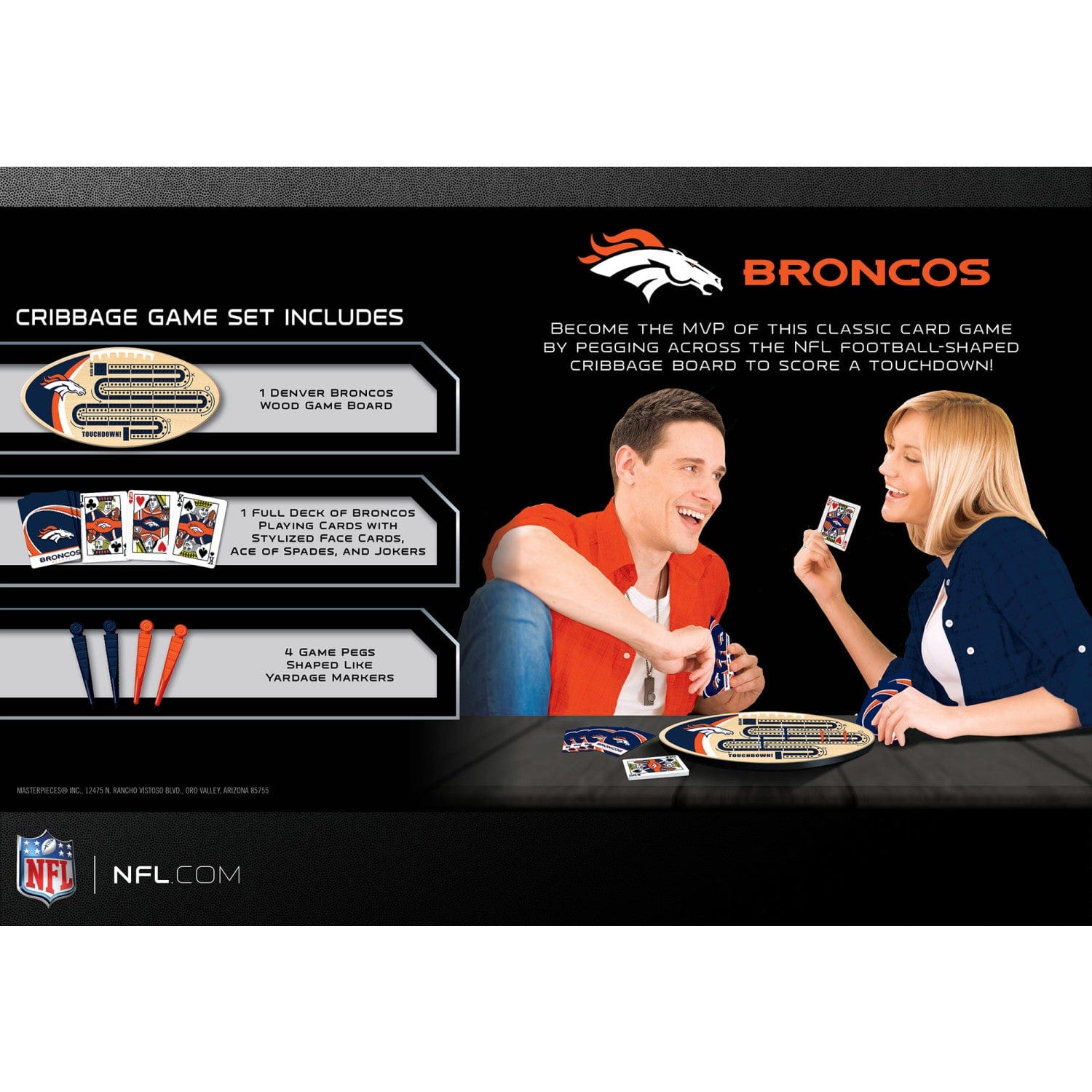 Looking for something fun and challenging to do while cheering on your Denver Broncos? Look no further than this MasterPieces officially licensed NFL Denver Broncos Cribbage Game Set for adults and families! This set includes a durable wood-finished cribbage game board, shaped like a football, with authentic Denver Broncos logos. Peg your way around the board with Yardage Marker Pegs, and make runs with hand-drawn Kings, Queens, and Jacks dressed in team gear. This Cribbage Game Set is perfect for the ultimate fan of the Denver Broncos and Cribbage.