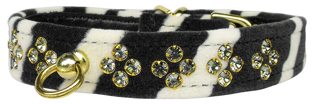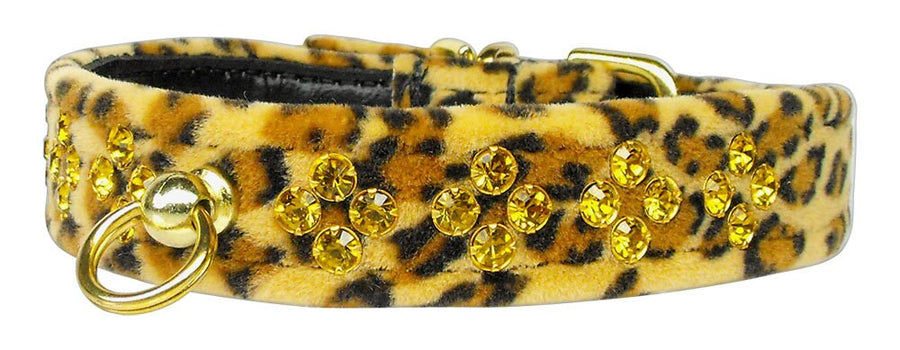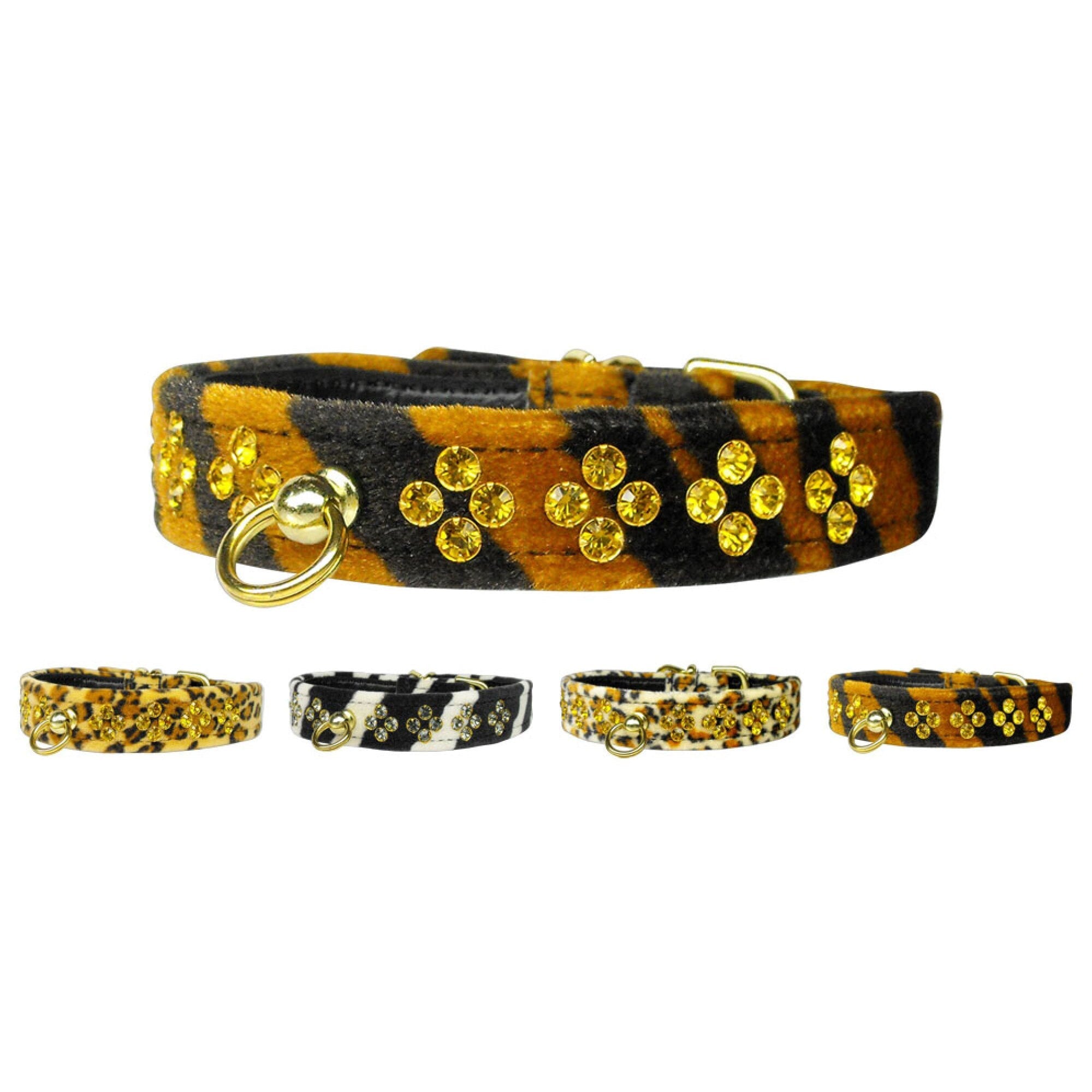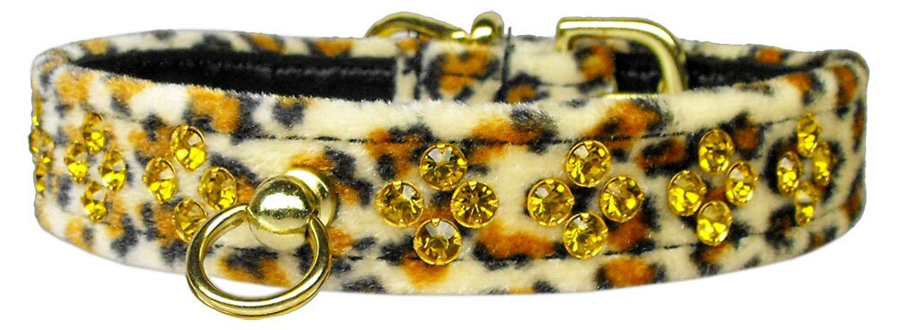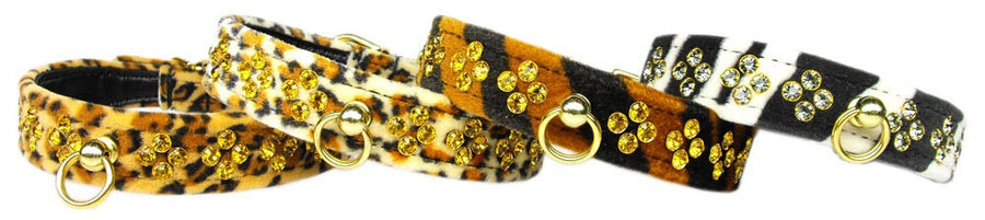 What a fun and furry animal print dog collar! This ¾" wide crystal collar tapers down to 1/2" near the buckle for added comfort. Adorned with offset, handset crystal clusters to give the collar a unique and glitzy look, it comes with a center post for a pet I.D. tag.