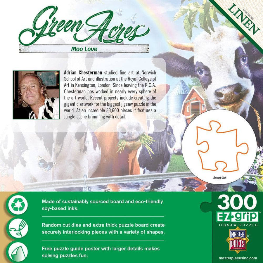 This MasterPieces 18" x 24" 300pc EZ Grip Green Acres Collection features images of farm town favorite animals beautifully hand-painted by talented artist Dona Gelsinger. Moo Love puzzle shows a cheerful image of Dairy cows out by the barn enjoying a drink and afternoon snack surrounded by citrus trees and countless flowers. Both the packaging and puzzles in this series are made of linen paper. The linen texture matte feel helps prevent glare and makes for an easy to use high-quality puzzling experience. The EZ-Grip die-cut used to make this puzzle offers larger puzzle pieces that snap together perfectly, without compromising image quality. To reduce its impact on our environment, the chipboard used in this puzzle is made of 100% recycled material.