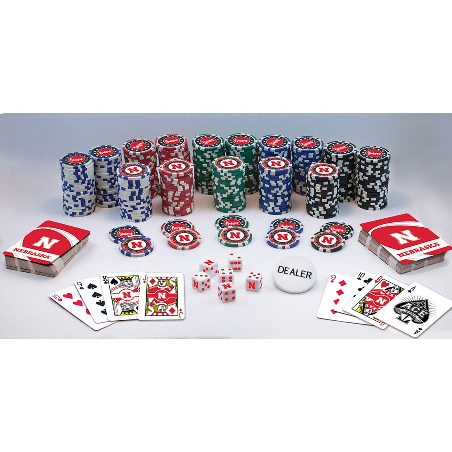 Looking for a great way to support your favorite team on poker night? Well, ante up with MasterPieces officially licensed NCAA Nebraska Cornhuskers 300 Piece Casino Style Poker Chips! These heavy 11.5-gram chips are perfect for Texas Hold'EM, Blackjack, card games, and much more. The poker set includes 300 high-quality standard-colored poker chips (11.5g) featuring two unique team designs. 60 White Chips, 60 Red Chips, 60 Blue Chips, 60 Green Chips, and 60 Black Chips. 6 standard-size (16mm) dice featuring your team's logo and colors on each die, 2 decks of playing cards with card-back designs featuring your favorite team's logo. All face cards and jokers have detailed custom team designs. 1 dealer button. Plus, an easy-to-carry sturdy aluminum case has a black velour interior to protect and organize poker chips, playing cards, and dice.