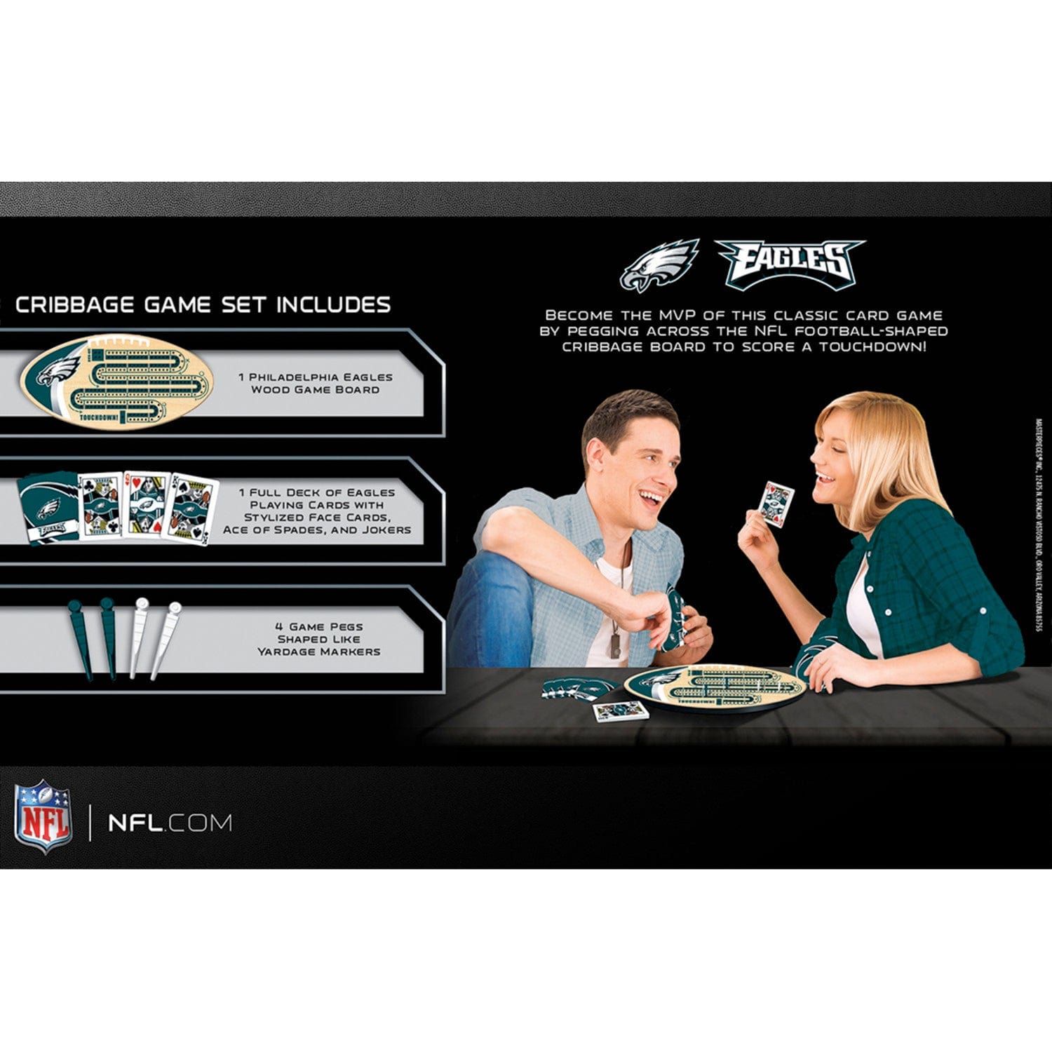 Looking for something fun and challenging to do while cheering on your Philadelphia Eagles? Look no further than this MasterPieces officially licensed NFL Philadelphia Eagles Cribbage Game Set for adults and families! This set includes a durable wood-finished cribbage game board, shaped like a football, with authentic Philadelphia Eagles logos. Peg your way around the board with Yardage Marker Pegs, and make runs with hand-drawn Kings, Queens, and Jacks dressed in team gear. This Cribbage Game Set is perfect for the ultimate fan of the Philadelphia Eagles and Cribbage.