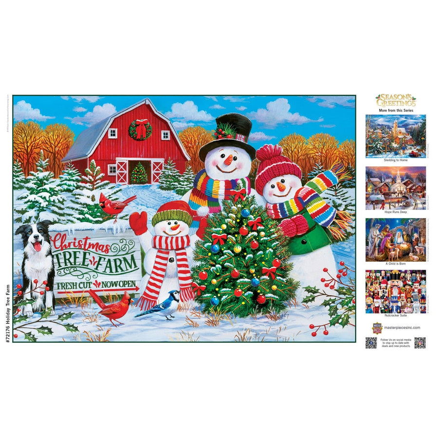 These MasterPieces 19.25" x 26.75" 1000pc of Home for the Holidays features a family of snowmen welcome visitors to the tree farm. Holiday Puzzles are the perfect way to get into the holiday spirit, and the perfect holiday presents for friends and family. Cozy up around the table for some holiday family fun! To reduce their impact on our environment, the chipboard used in these puzzles is made of 100% recycled material.