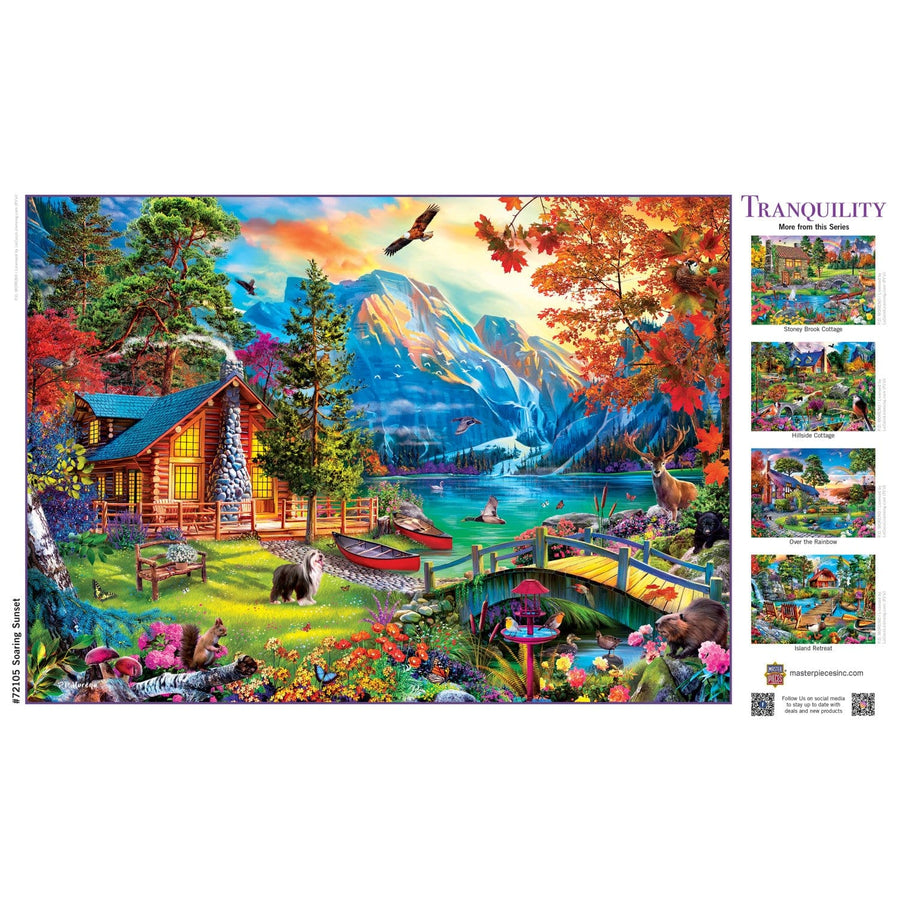 These MasterPieces 19.25" x 26.75" 1000pc Tranquility Puzzles, created by artists PD Moreno, feature a beautiful mountain cabin on a hidden lake. P.D. MORENO is two creative people (P.D. & Moreno) who joined their talents to create sensational artwork that has an international and mass appeal. Each person, one Italian and one American, brings a unique style and experience to the creative process that allows them to reach artistic heights that put them above the competition. With their colorful details and rich greenery, these puzzles are sure to delight, and are the perfect way to spend an afternoon. To reduce their impact on our environment, the chipboard used in these puzzles is made of 100% recycled material.