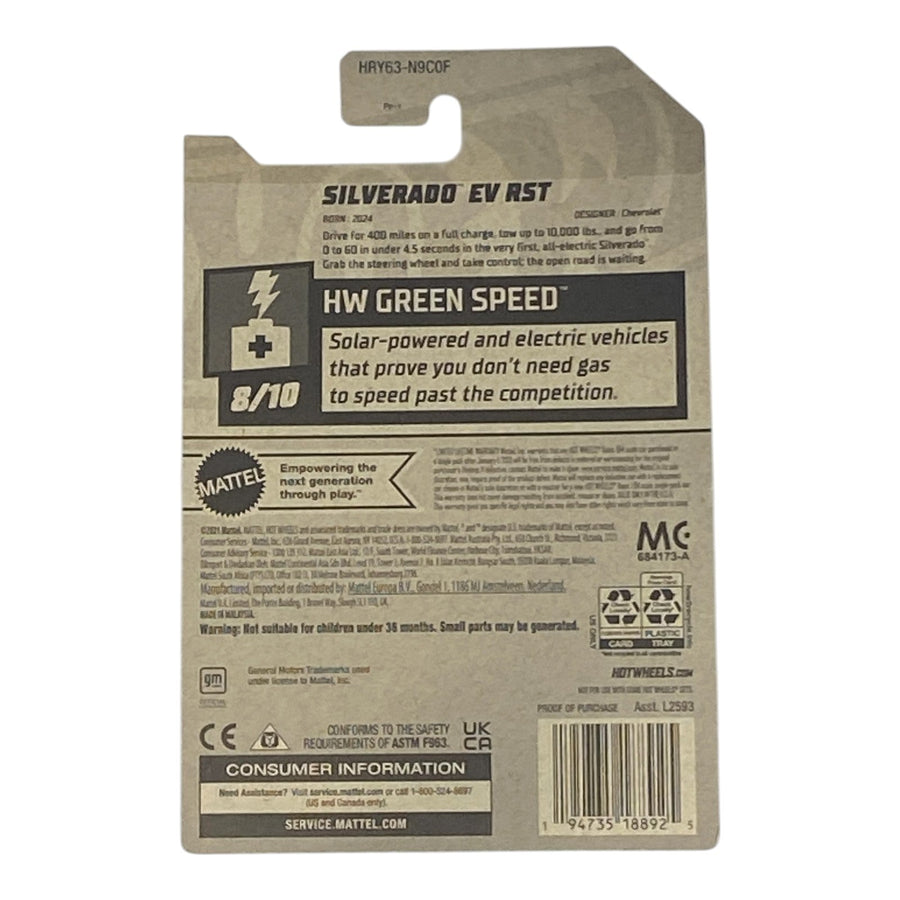 Add this electrifying blue Silverado EV RST to your Hot Wheels Green Speed lineup today and charge ahead in your diecast collection!