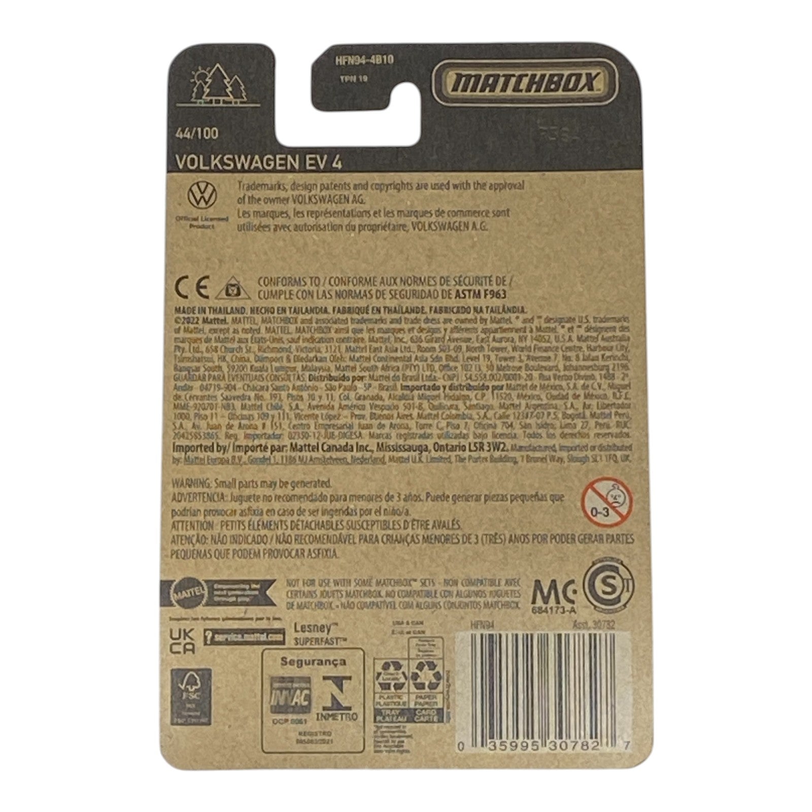 Discover the Matchbox Volkswagen EV 4 (Series 44/100), a highly detailed 1:64 scale diecast replica of the Volkswagen ID.4 electric SUV. This collectible toy car captures the modern design and eco-friendly spirit of VW's popular electric vehicle, making it a must-have for Matchbox enthusiasts, diecast collectors, and fans of Volkswagen models. Perfect for play or display, this authentic Matchbox piece brings sustainable innovation to your collection.