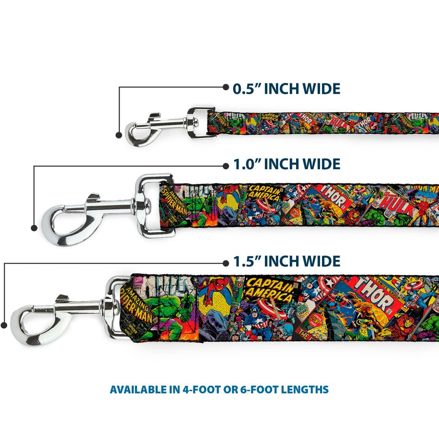 This fashion-forward dog leash is a great way to show off your favorite characters or brands. The durable components and beautiful printing ensure that the colors will continue to pop for years to come! It is made of high-density polyester and steel hardware. The leash is available in 0.5, 1.0 and 1.5 inches wide, and 4 and 6 feet in length. This product is Made in the USA by Buckle-Down Inc. and officially licensed by Marvel Comics.