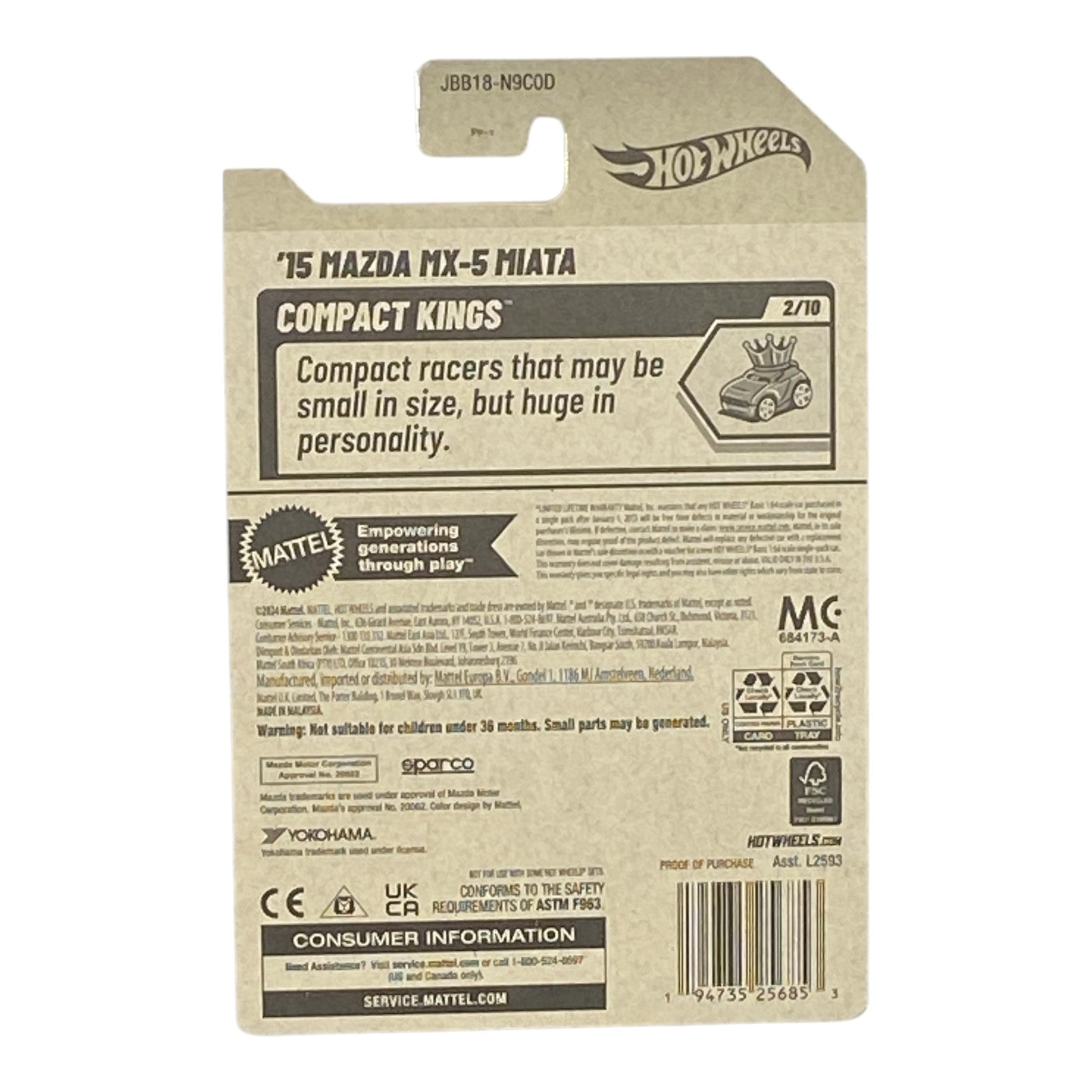 The Hot Wheels '15 Mazda MX-5 Miata is a must-have for any collector or car enthusiast. This die-cast model perfectly captures the sleek design and sporty essence of the original Mazda MX-5 Miata. As part of the Compact Kings Series 2/10, this model stands out with its attention to detail and vibrant color scheme.