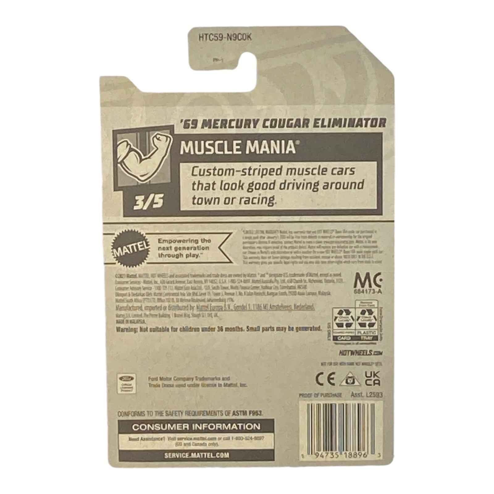 As a part of the Muscle Mania Series 3/5, this car embodies the essence of 1960s muscle cars, renowned for their performance and style. The vibrant colorways, combined with the precision design, make the Hot Wheels '69 Mercury Cougar Eliminator an attention-grabbing piece. Whether you're rolling it down a race track or showcasing it on a shelf, this die-cast vehicle is a tribute to automotive history.