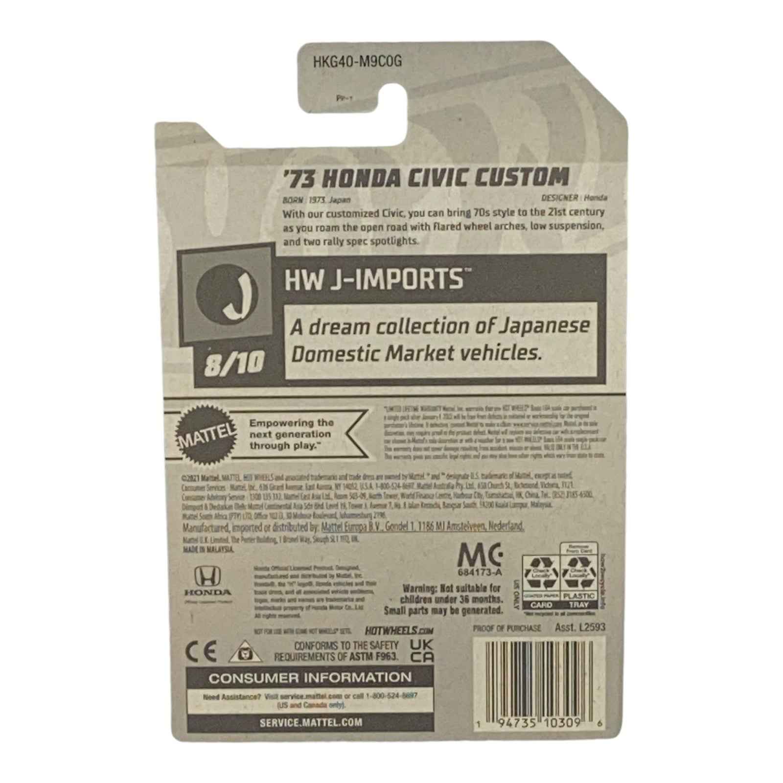 The Hot Wheels '73 Honda Civic Custom not only serves as a fantastic piece of memorabilia but also encapsulates the creative spirit of the automotive world. The custom modifications and the model’s robust build make it a standout item for both young fans and seasoned collectors. This model is part of the J-Imports series, celebrating the finest Japanese imports from past decades, thus ensuring its special place in the Hot Wheels lineup.