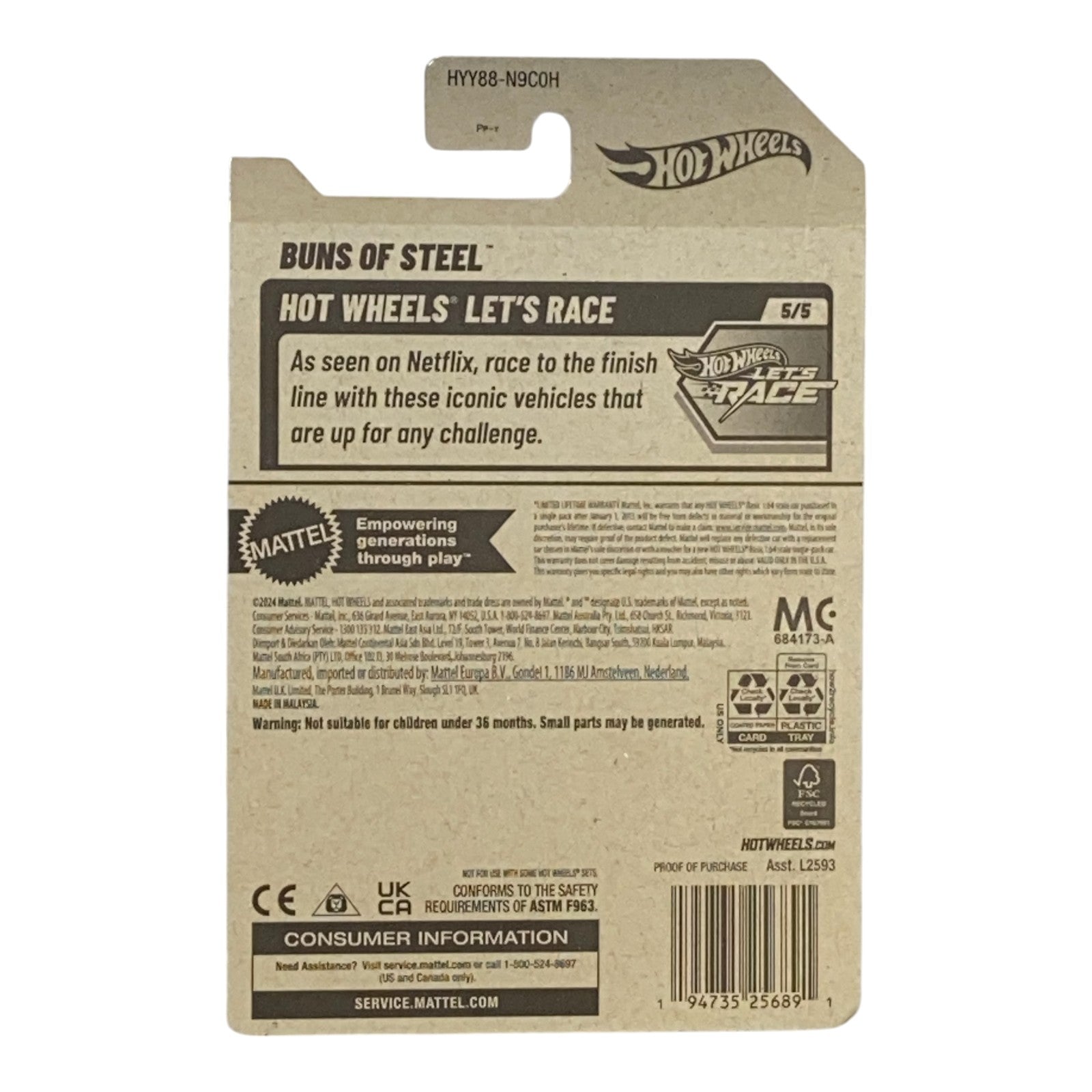 With the latest release in the Let's Race Series, this 5th edition of Hot Wheels Buns of Steels showcases the signature creativity and craftsmanship that Hot Wheels is known for. Each model in this series is meticulously crafted to not only look fantastic but also to deliver superior racing capabilities. This product is perfect for those who wish to expand their Hot Wheels collection or looking for the perfect gift for a racing fan.