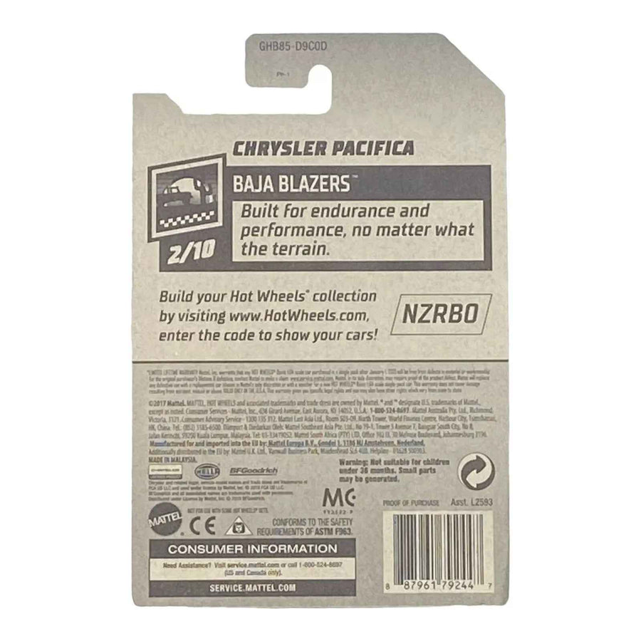 Taking inspiration from racing and adventure, the Baja Blazers series is designed for those who love to see their vehicles tackle terrain and adventures. The Chrysler Pacifica model showcases the capability of this vehicle in a fun, compact form. It's perfect for racing on tracks or displaying proudly among your collection. Embrace the thrill of adventure and the charm of the Chrysler Pacifica with this unique Hot Wheels model.