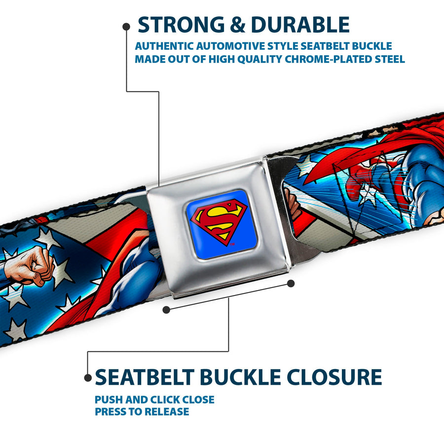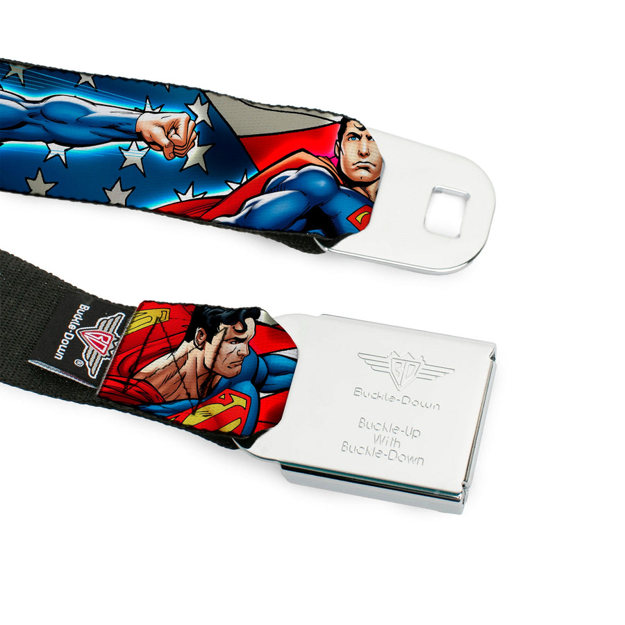 Superman Full Color Blue Seatbelt Belt - Superman Action Poses/Stars & Stripes Webbing