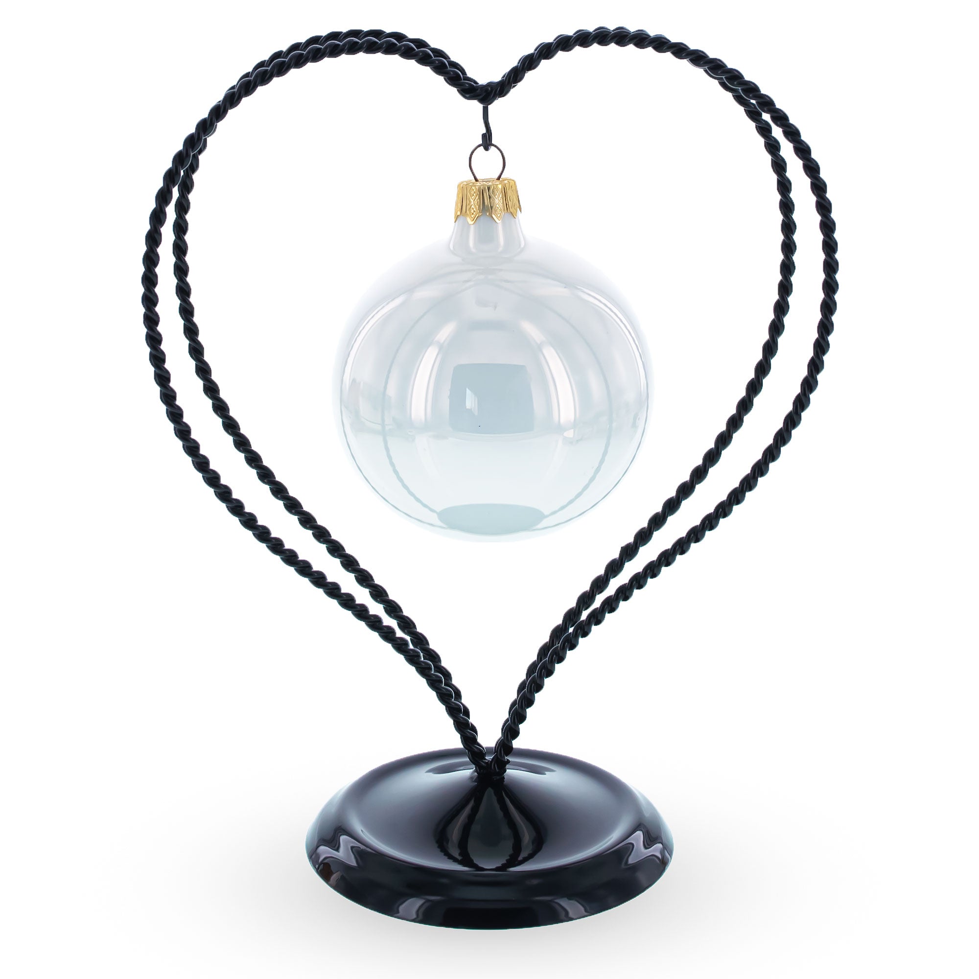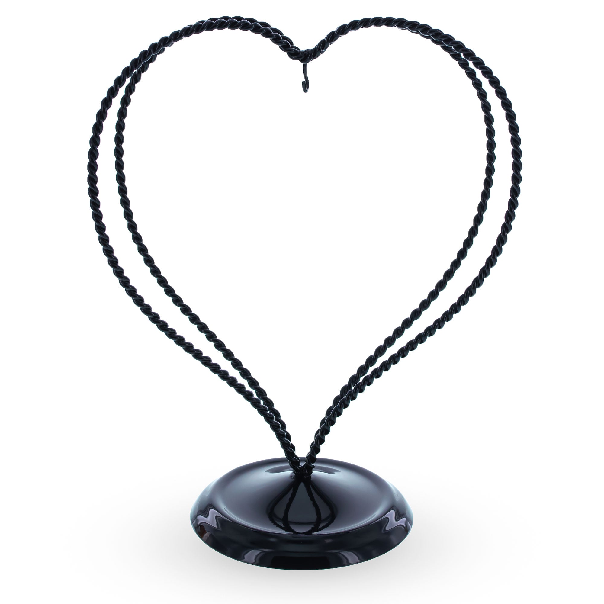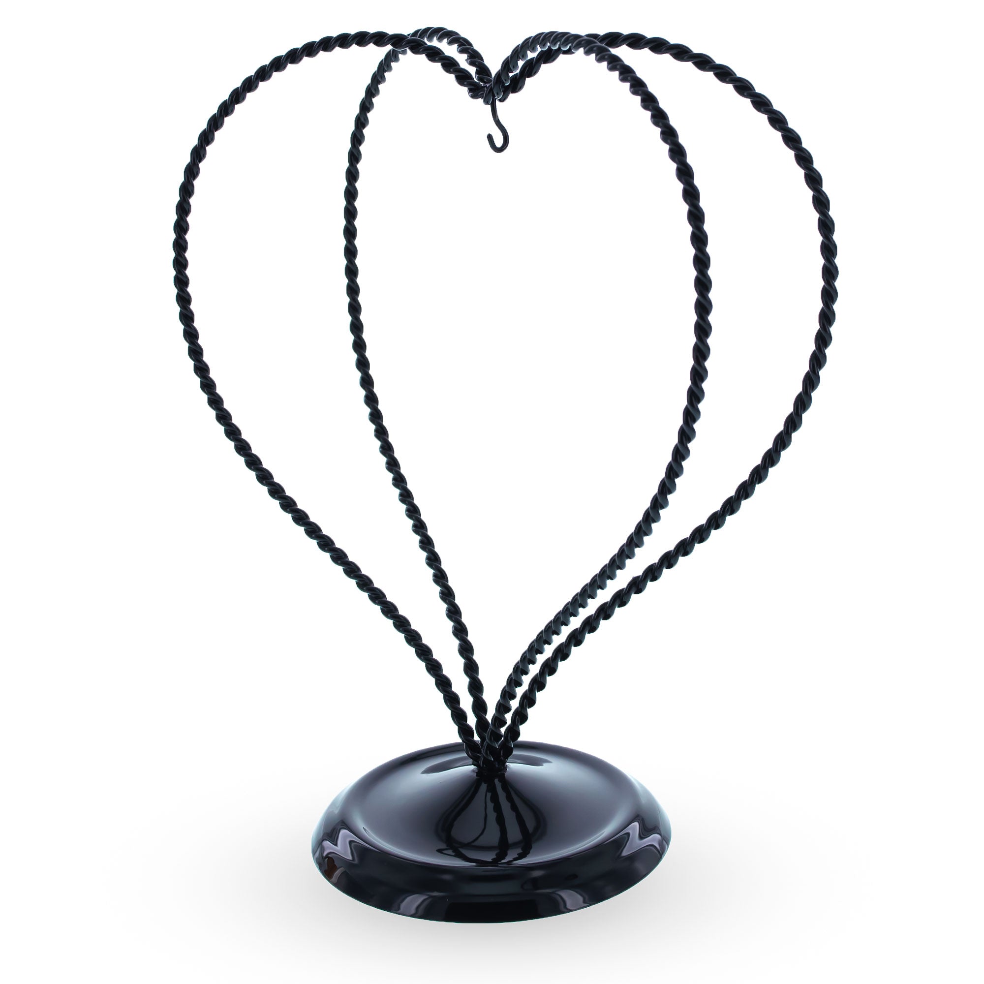 Celebrate love and craftsmanship with this 7.8-inch double-twisted heart ornament display stand. Made from black painted metal, the stand features two elegantly twisted wires forming a romantic heart silhouette. Its graceful curves and balanced structure are ideal for displaying cherished ornaments, keepsakes, or small decorative pieces. A smooth, weighted base ensures stability, while the central hanging hook allows your item to remain the center of attention.