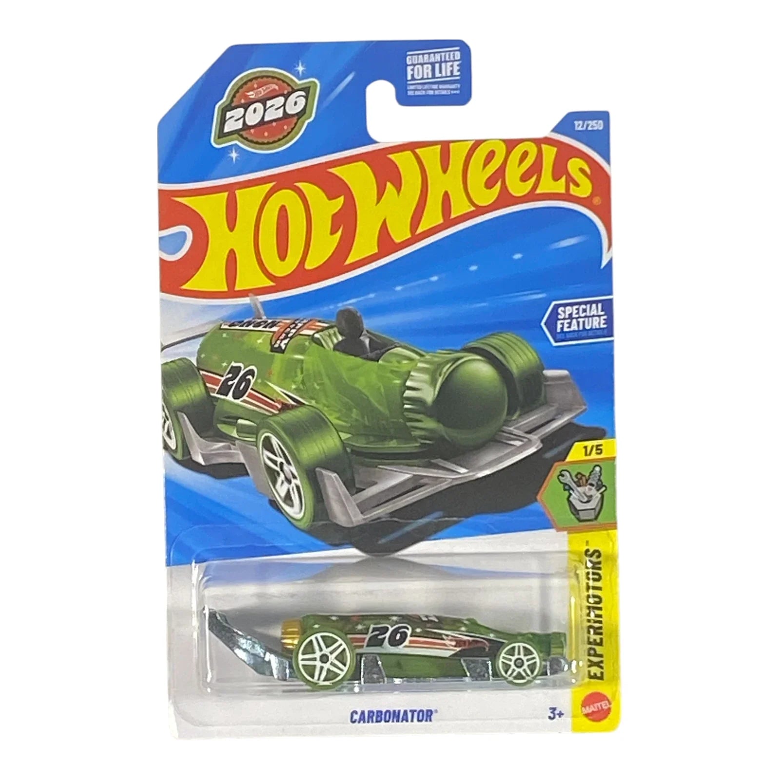 Discover the Hot Wheels Carbonator Happy New Year 2026 edition, a thrilling limited-release diecast car from the Experimotors series! This iconic 1:64 scale model features a jet-powered soda bottle design with a shiny green finish, celebrating the new year in high-speed style. As #1/5 in the Experimotors lineup and #12/250 overall, it's a must-have for Hot Wheels collectors seeking unique, functional fantasy castings.