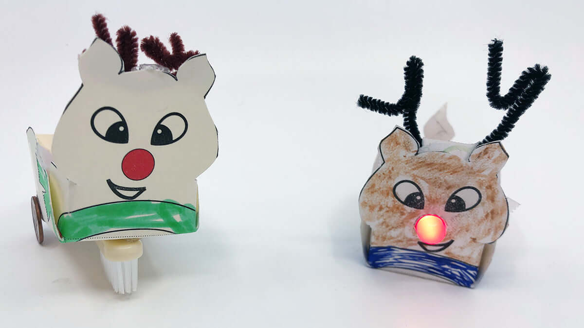 Use colored pencils or markers to decorate your reindeer racer template and laser cut head. Fold and tape the template, then drop in the Shake-it board and your racer is on the move! For your ornament, use the LED as your reindeer's shiny nose and a conductive tape strip and coin cell battery to light your way!